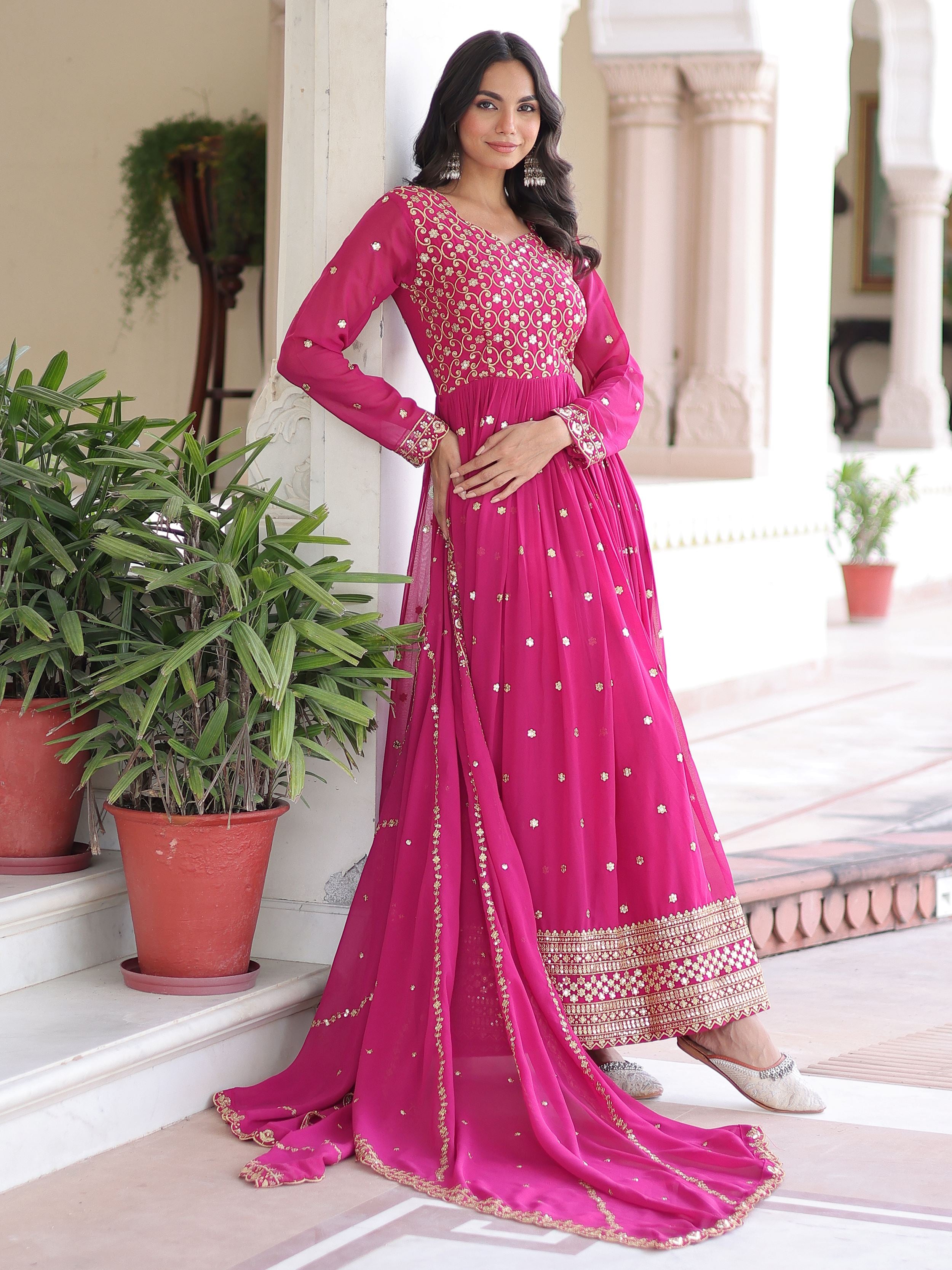 This beautiful Pink faux georgette gown features rich sequins and zari embroidered work, giving it a luxurious, festive charm. Designed with a Fancy PAN (V) Neck and full sleeves, it enhances elegance effortlessly.