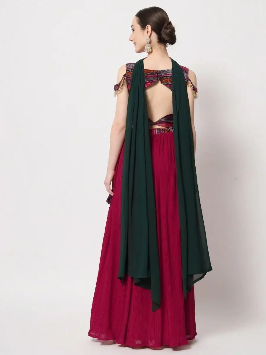 Paired this pink plain lehenga with similar color choli with fancy prints and cold-shoulder pattern with flaunted georgette fancy dupatta.