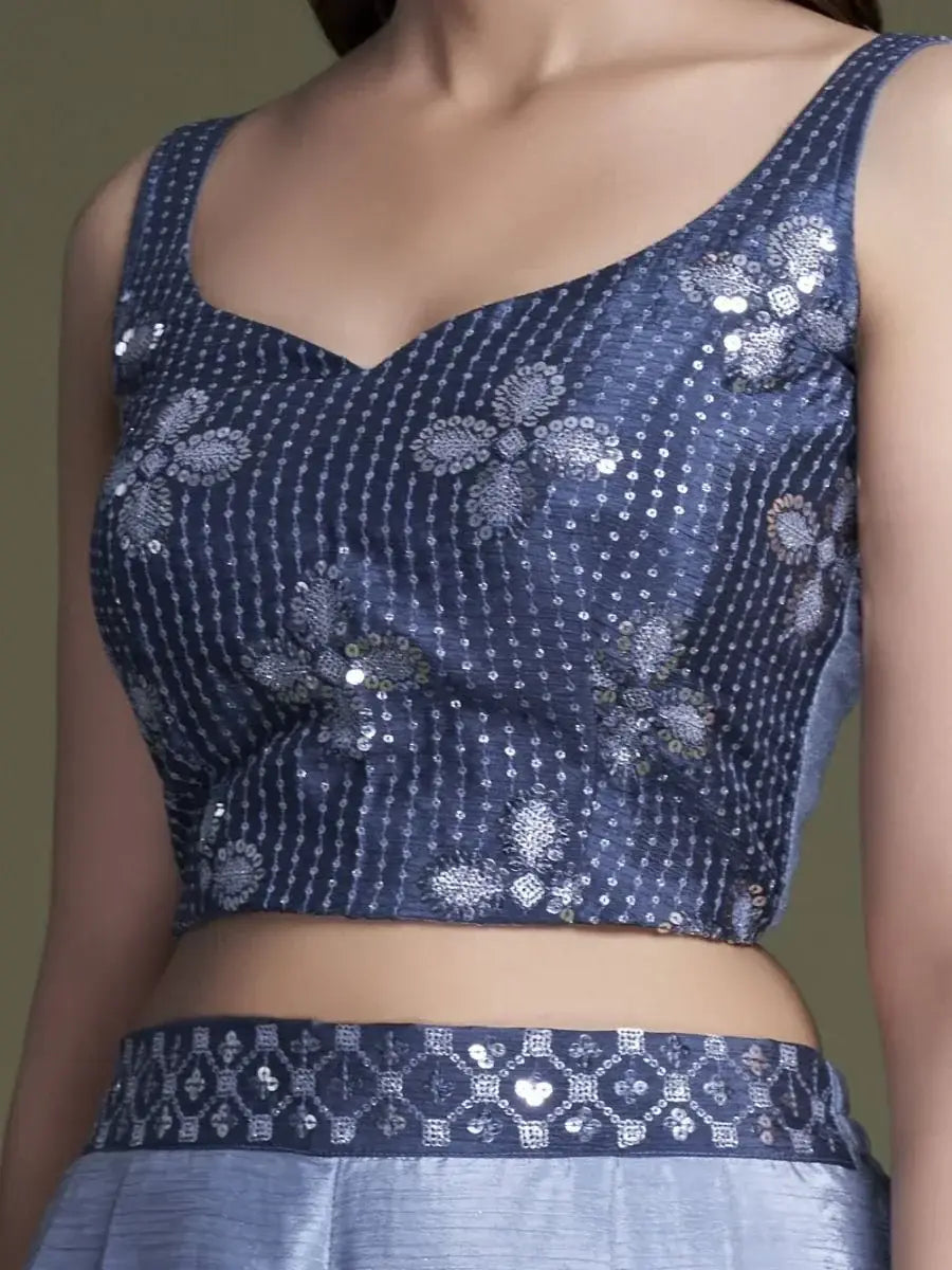 This outfit is its stunning design, which features intricate sequins work and thread embroidery that adds a touch of glamour to the outfit. The crop top is sleeveless with a V-shaped neck, and the palazzo has threadwork and sequin work on the waist. The outfit also comes with a matching blue sequin work chinon shrug that adds an extra layer of elegance to the ensemble.