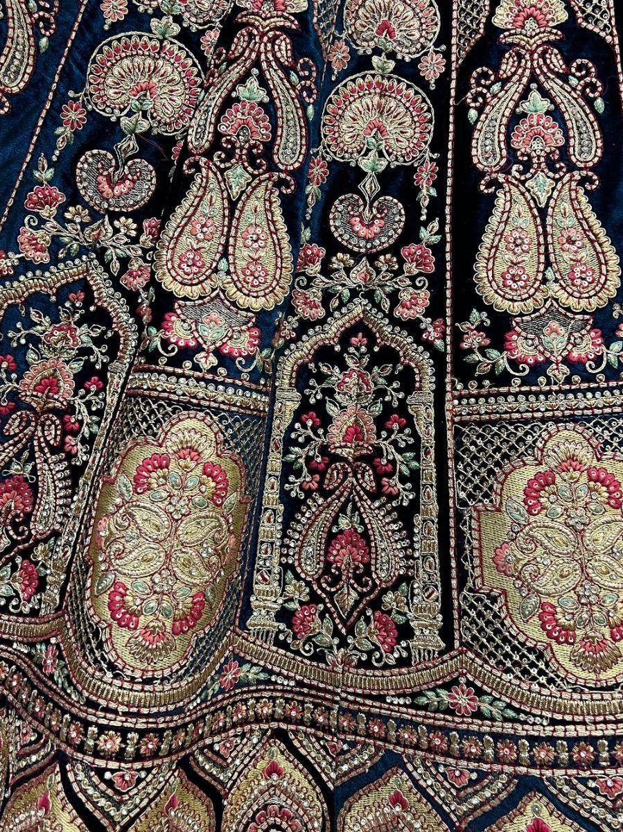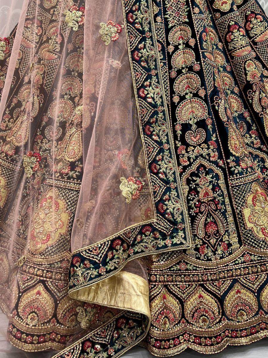 Bring back the traditional charm to your closet with this exceptional blue color lehenga crafted with velvet material and completed with fancy embroidery, stonework, and dori work.