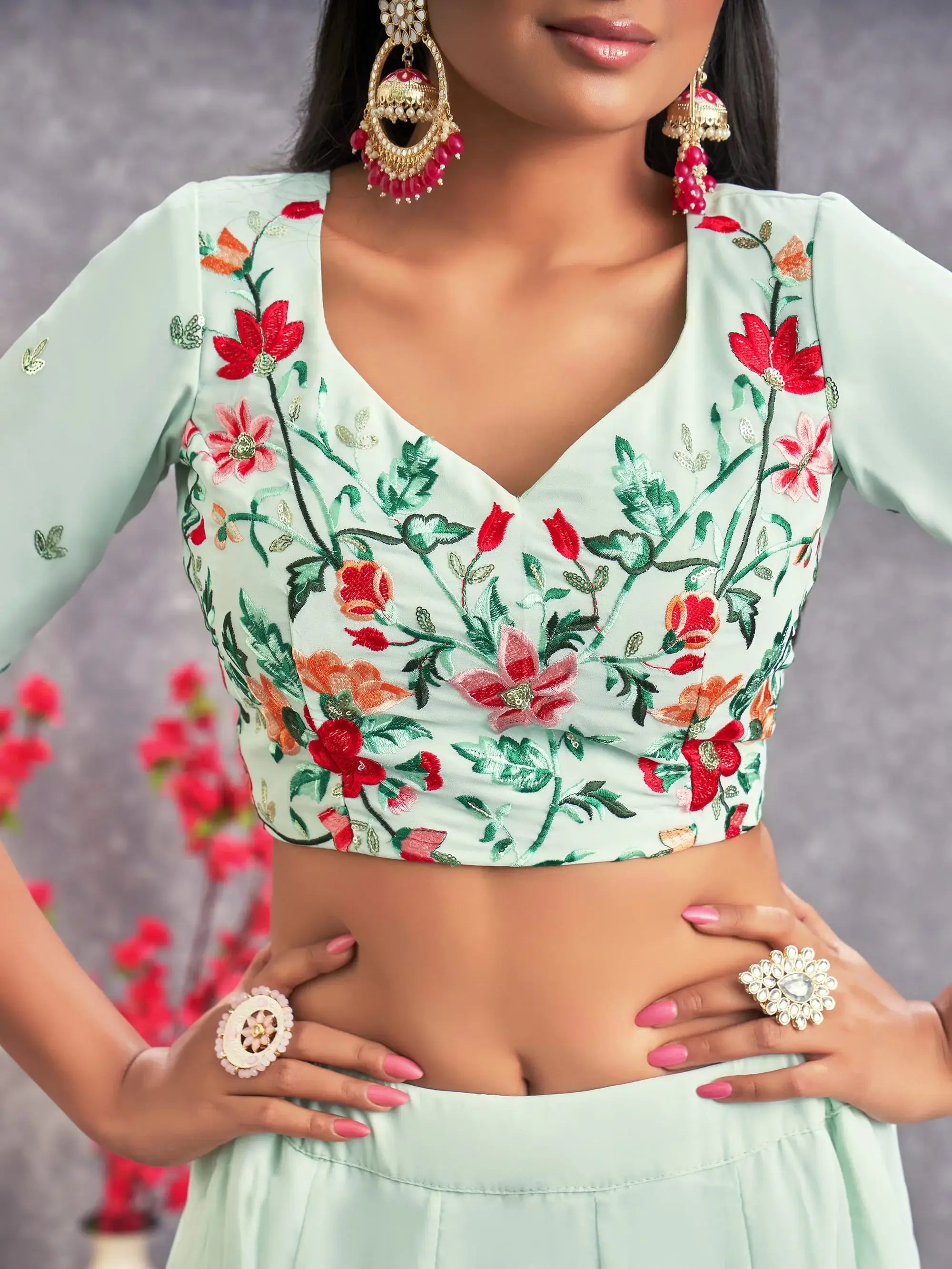 Be the sunshine of everyone's eyes dressed in this stunning sea green color lehenga made of georgette material achieved with thread embroidery and sequins work.