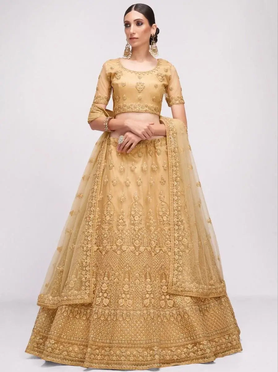 Exclude some dreamy vibes dolled up in this light brown colored net with silk inner material lehenga designed with exquisite cording, thread, sequins embroidery, and stonework. This lehenga comes with an embroidered belt.