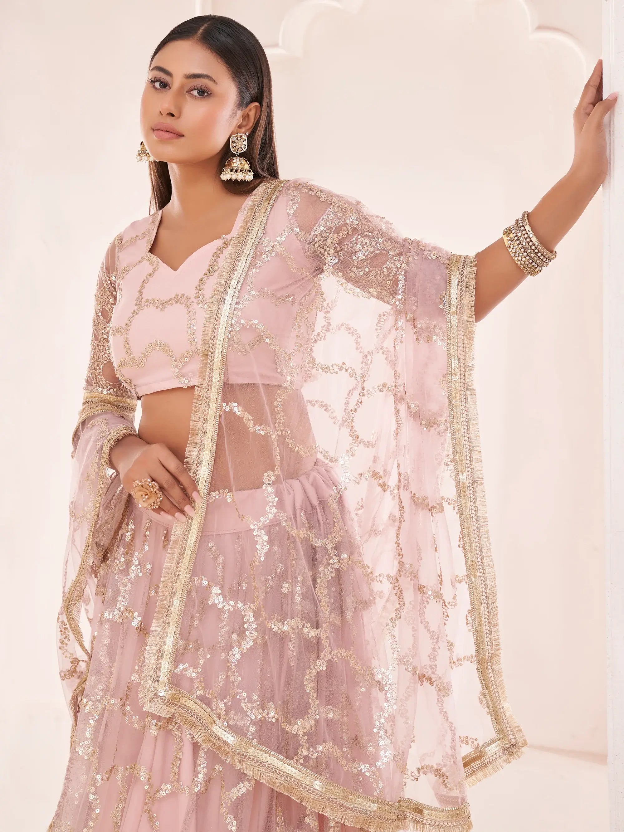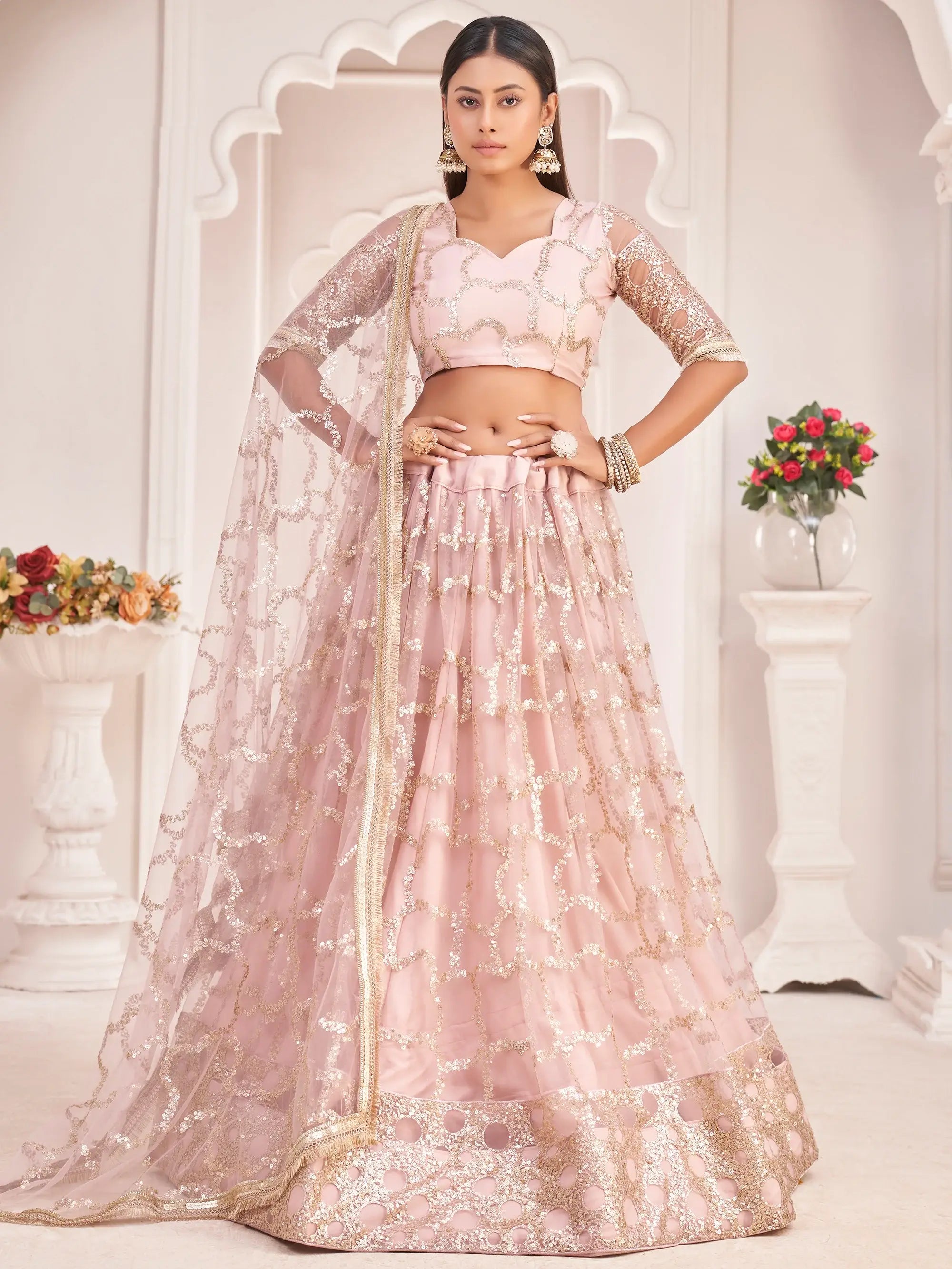 Precise beauty can come out from your dressing trend with this graceful pastel pink color lehenga made with net material completed with thread and sequins embroidery. It also has American crepe inner material.