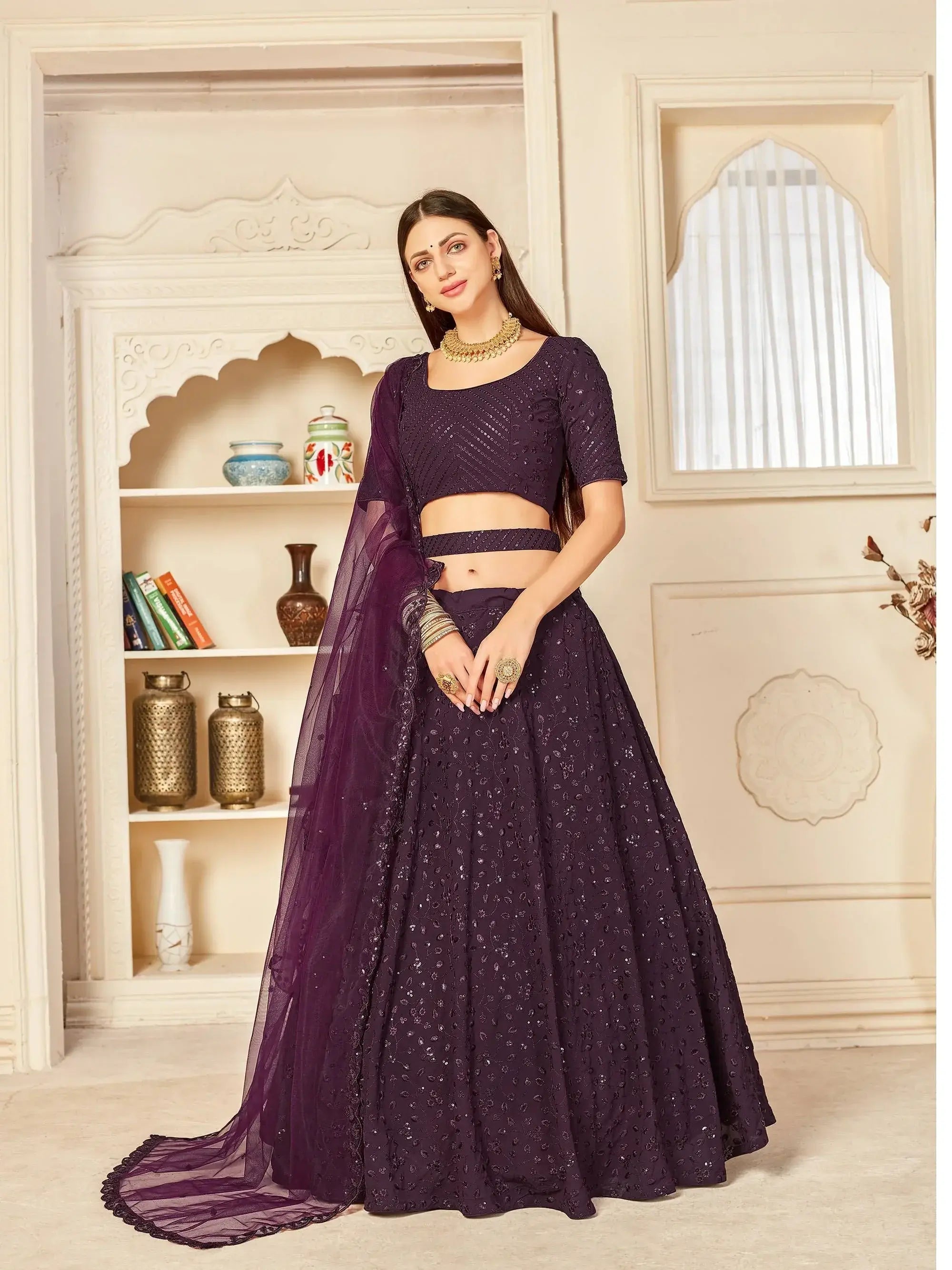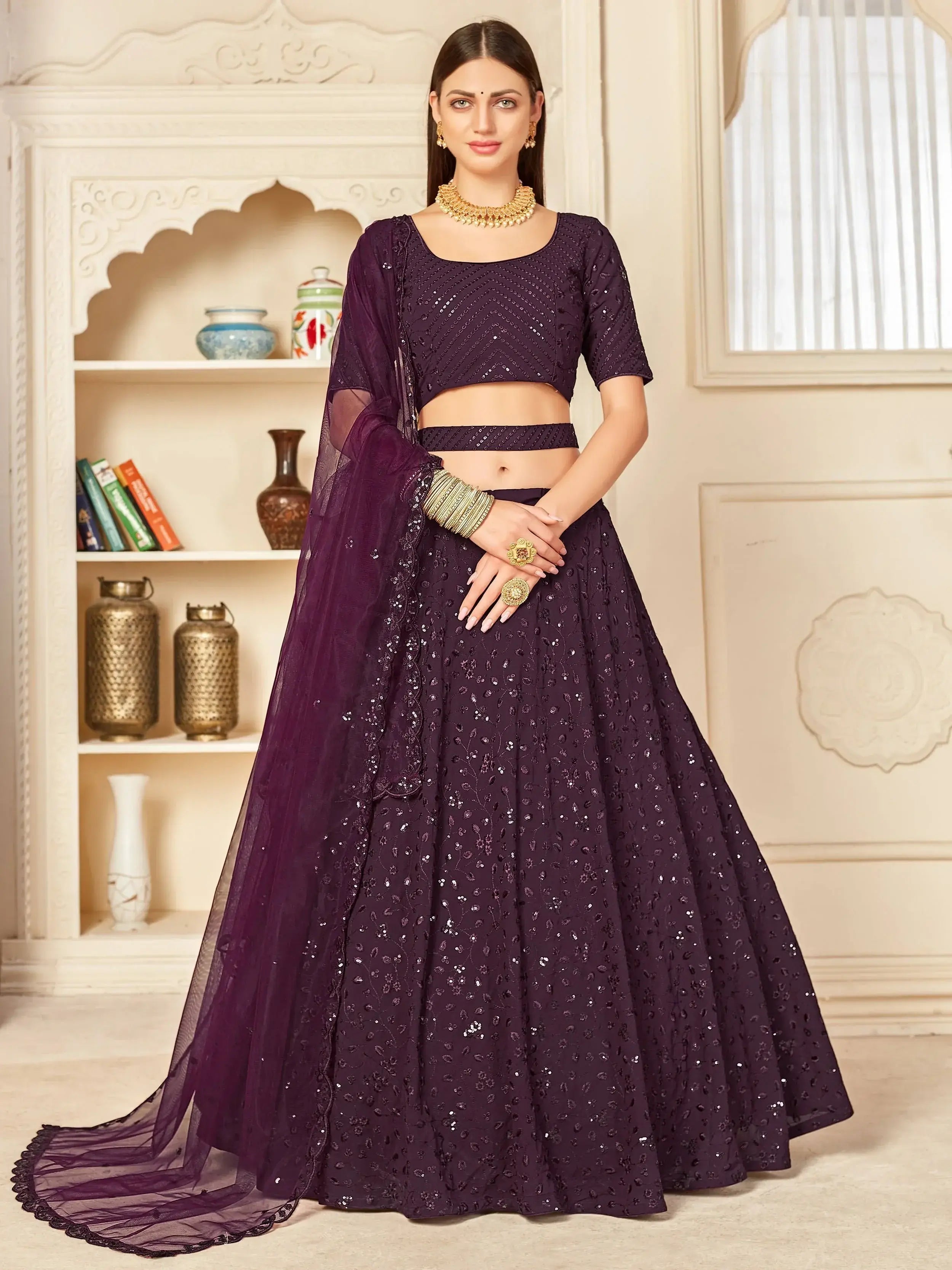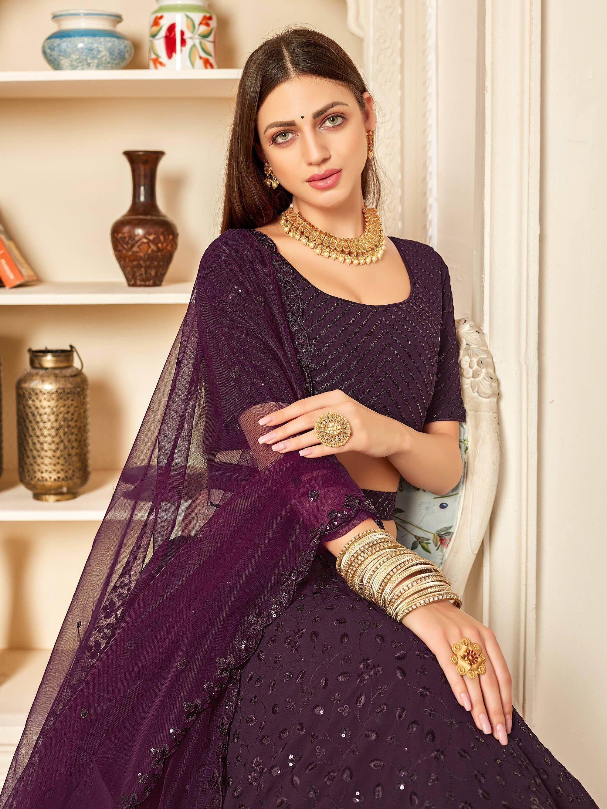 Be a center of the attraction donning this beautiful purple-colored lehenga made of georgette fabric with thread and sequins embroidery adornments.