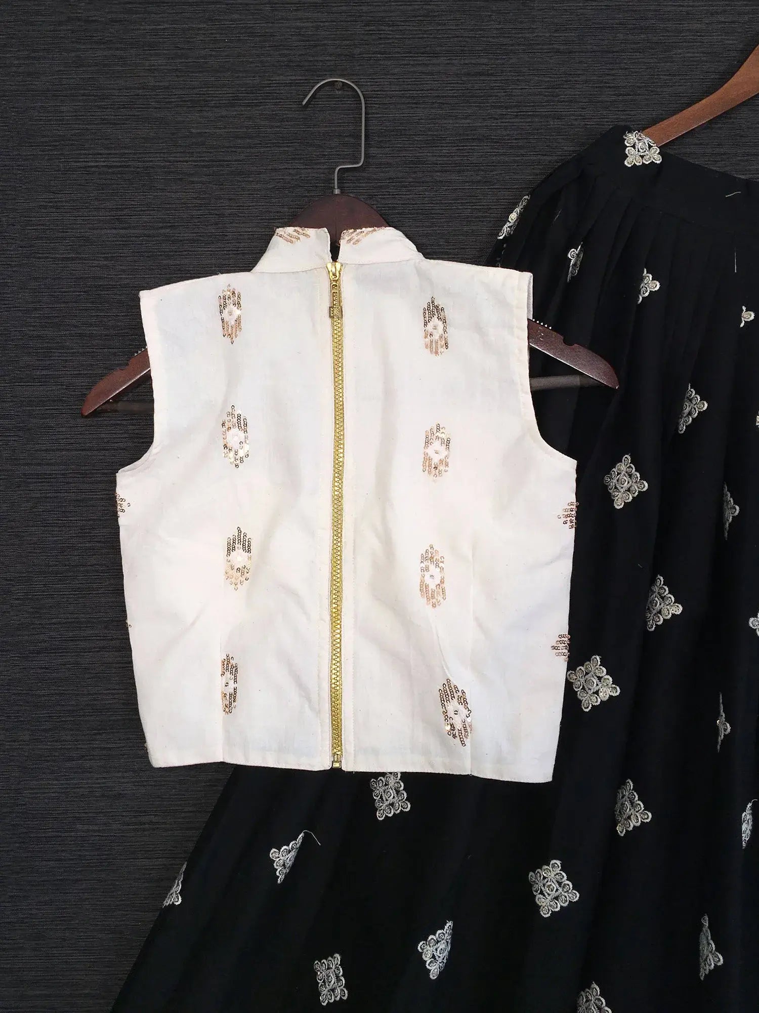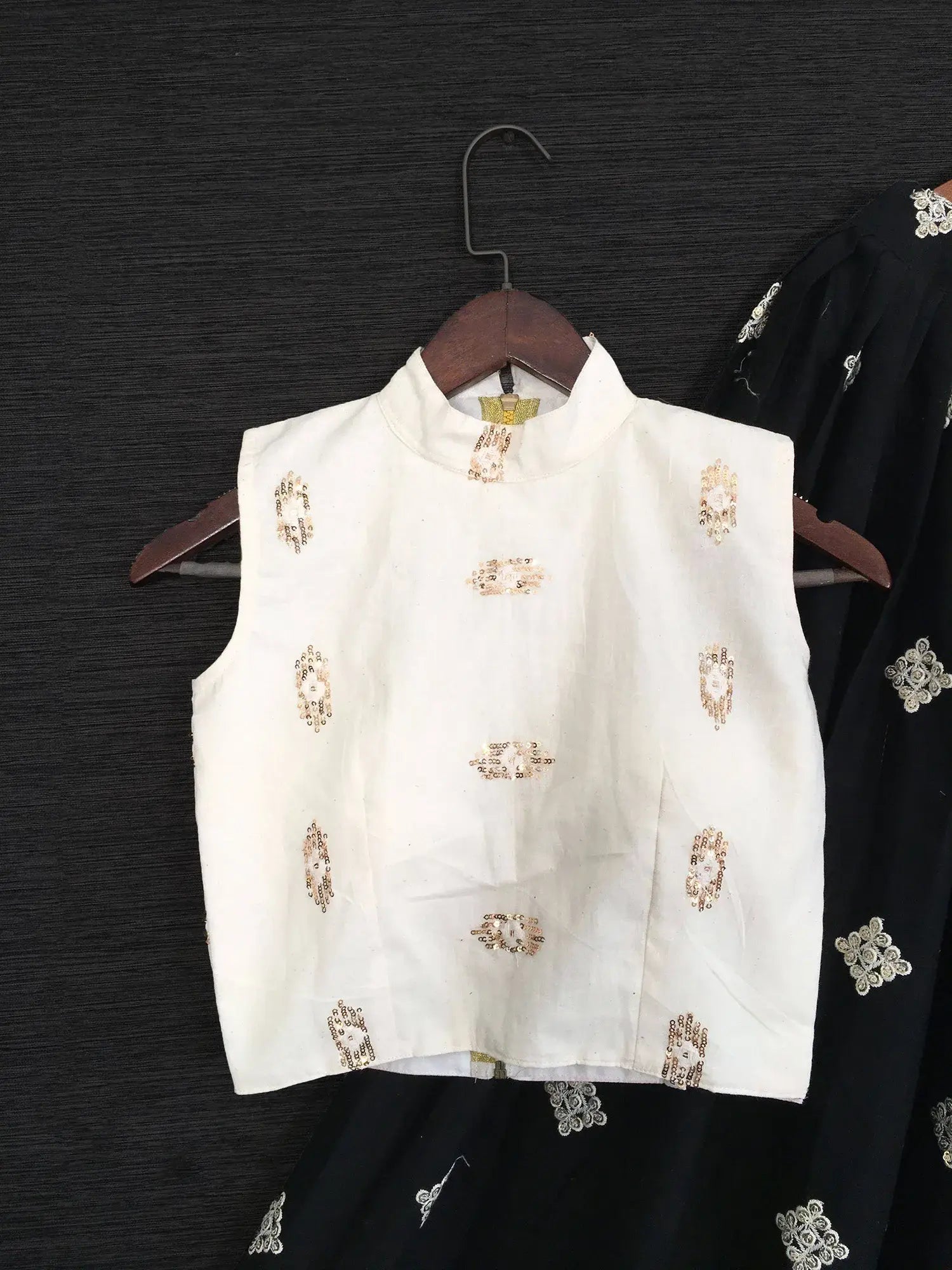This elegant black crop top lehenga is crafted from soft cotton and features delicate white thread embroidery in symmetrical floral motifs across the flared skirt. The intricate detailing adds a refined charm, making it a beautiful blend of tradition and modern flair.