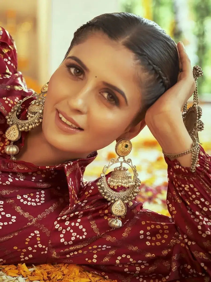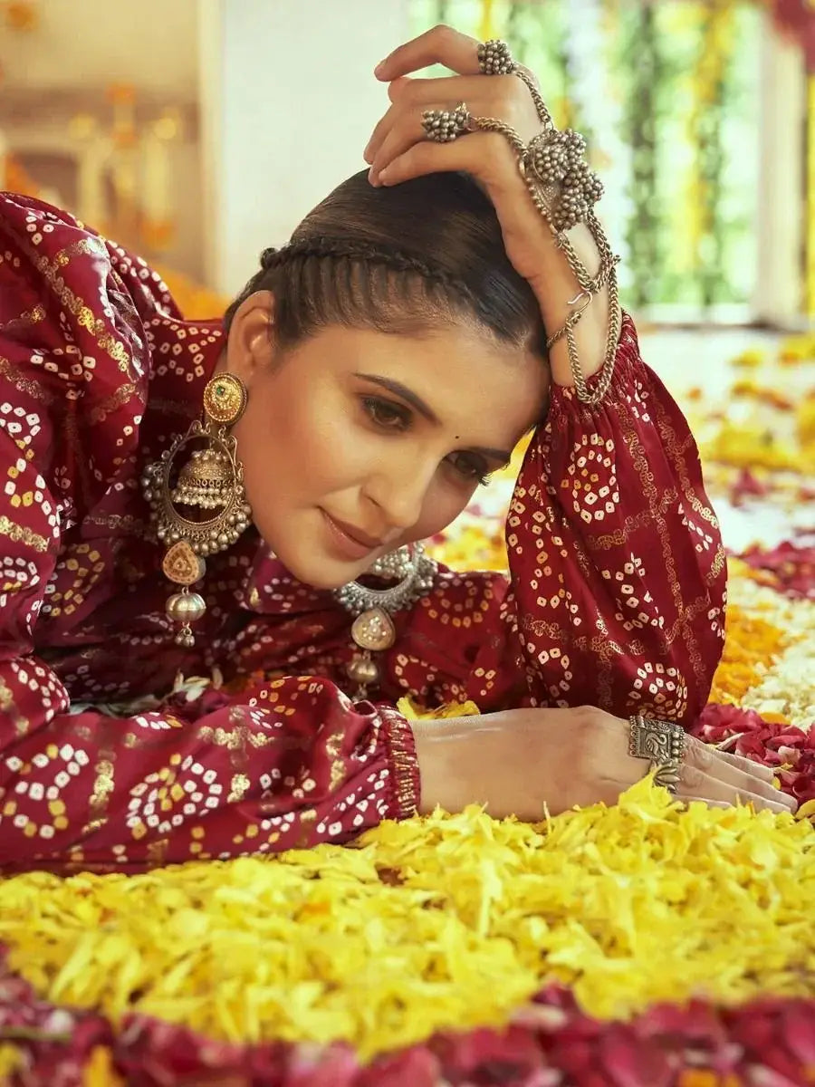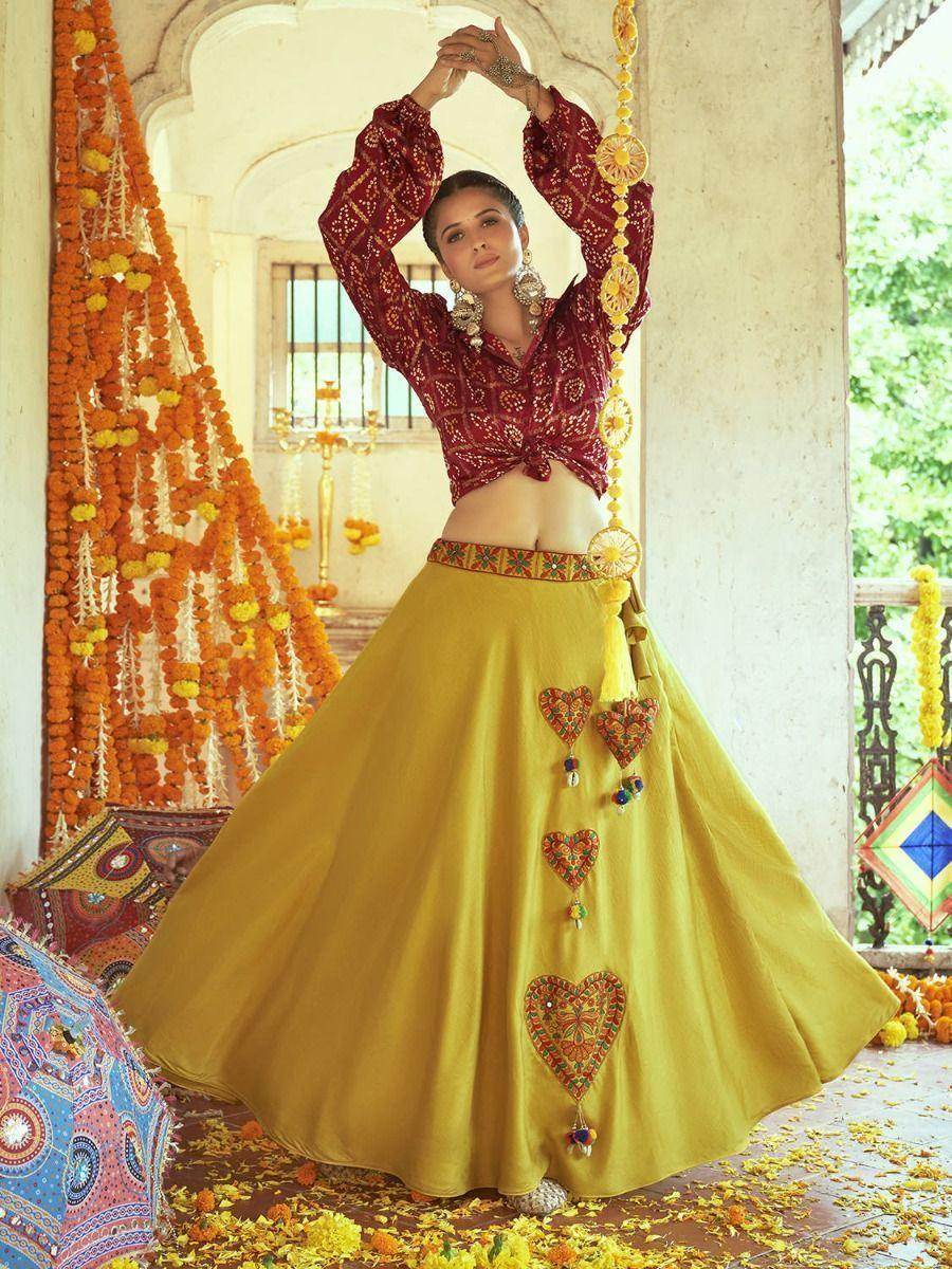 <li style="text-align: justify;"><span data-preserver-spaces="true">It comes with a contrasting maroon color gajji silk fabric featured with bandhani printed and long sleeves shirt style crop top and ties knot design and all-over digital print.</span></li>