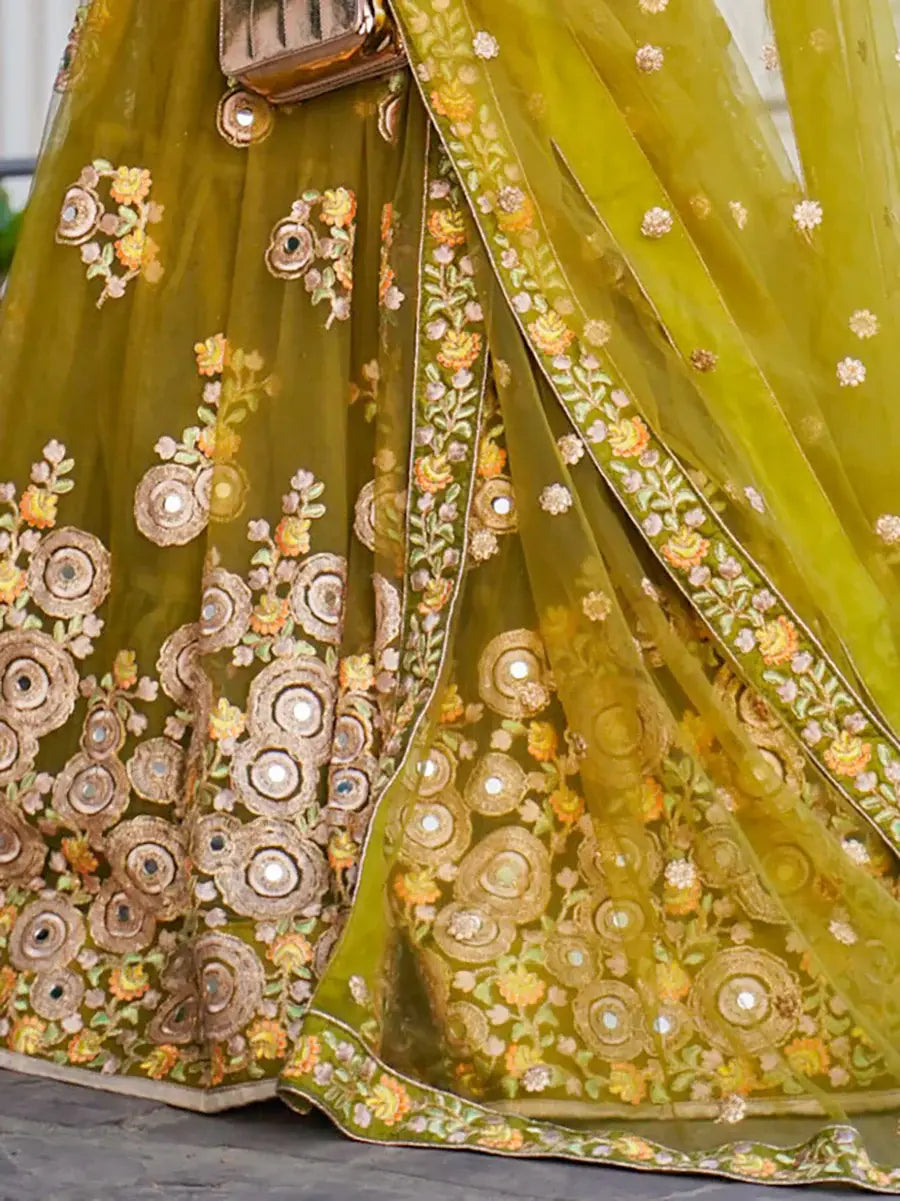Show your fashion game on every festival wearing this amazing green color lehenga made of net material embellished with beautiful mirror work and floral embroidery all over. This stunning lehenga choli set is the perfect outfit for weddings, festivals, and other special occasions.