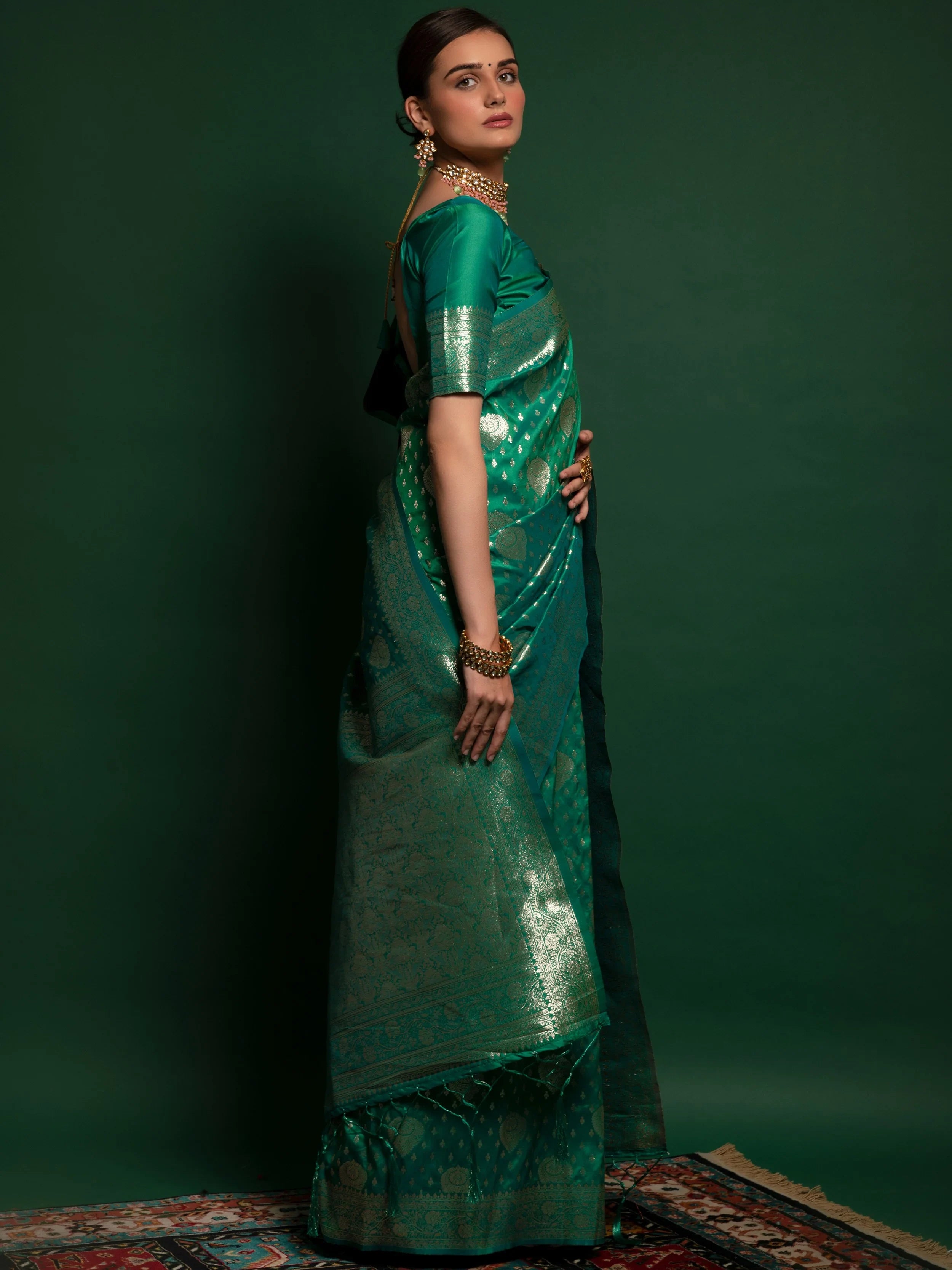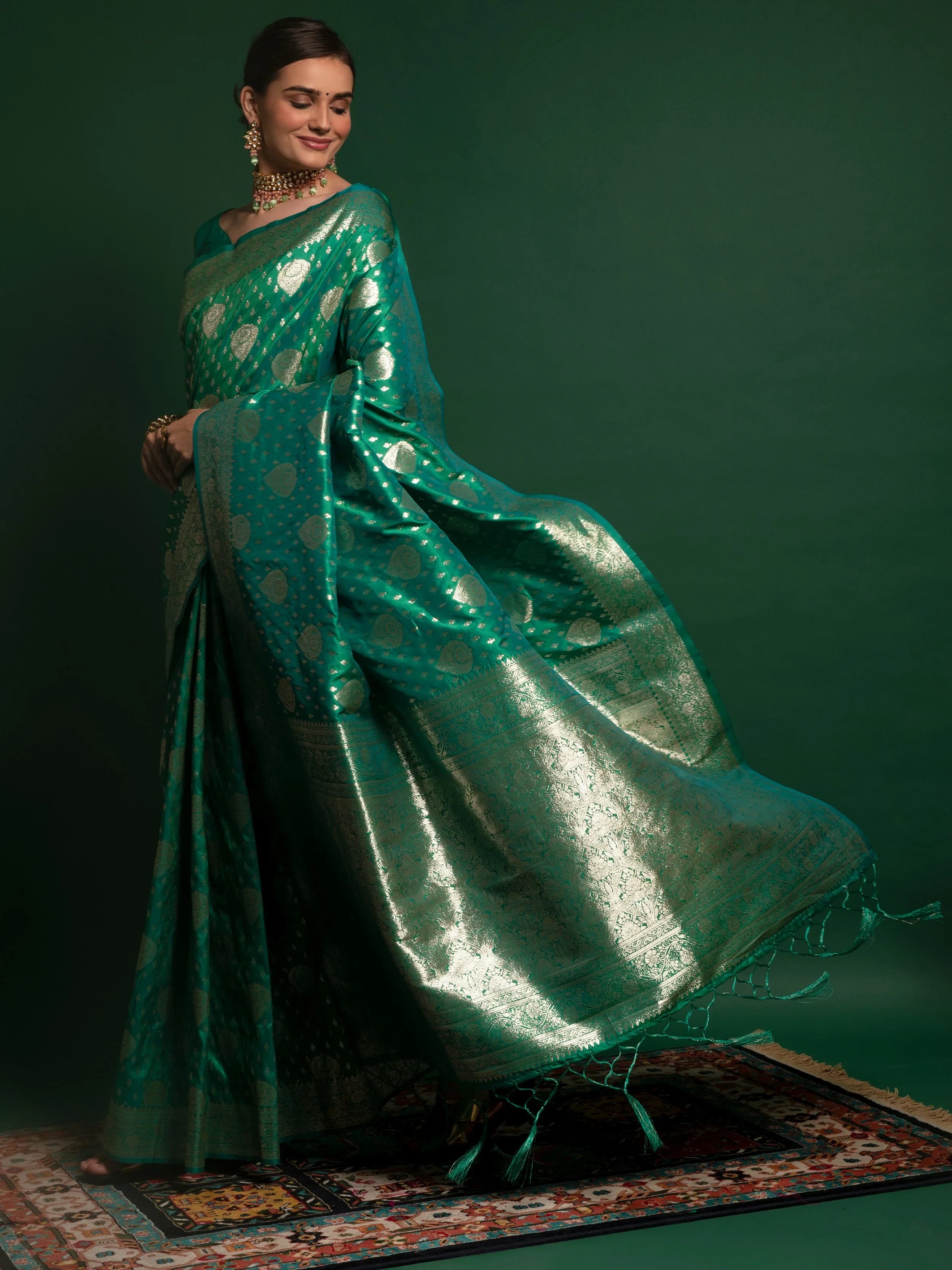 Presenting a gorgeous amalgamation of India's rich culture and tradition this unique green-colored silk saree is created with zari weaving all over the saree and also have thread zalar lace on the edge.