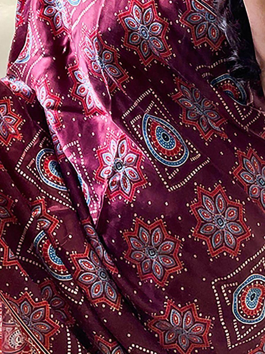 Drape the ethnicity in patola print crafted on gajji silk tinge in maroon shade with lagdi patta on pallu with thread tessels.
