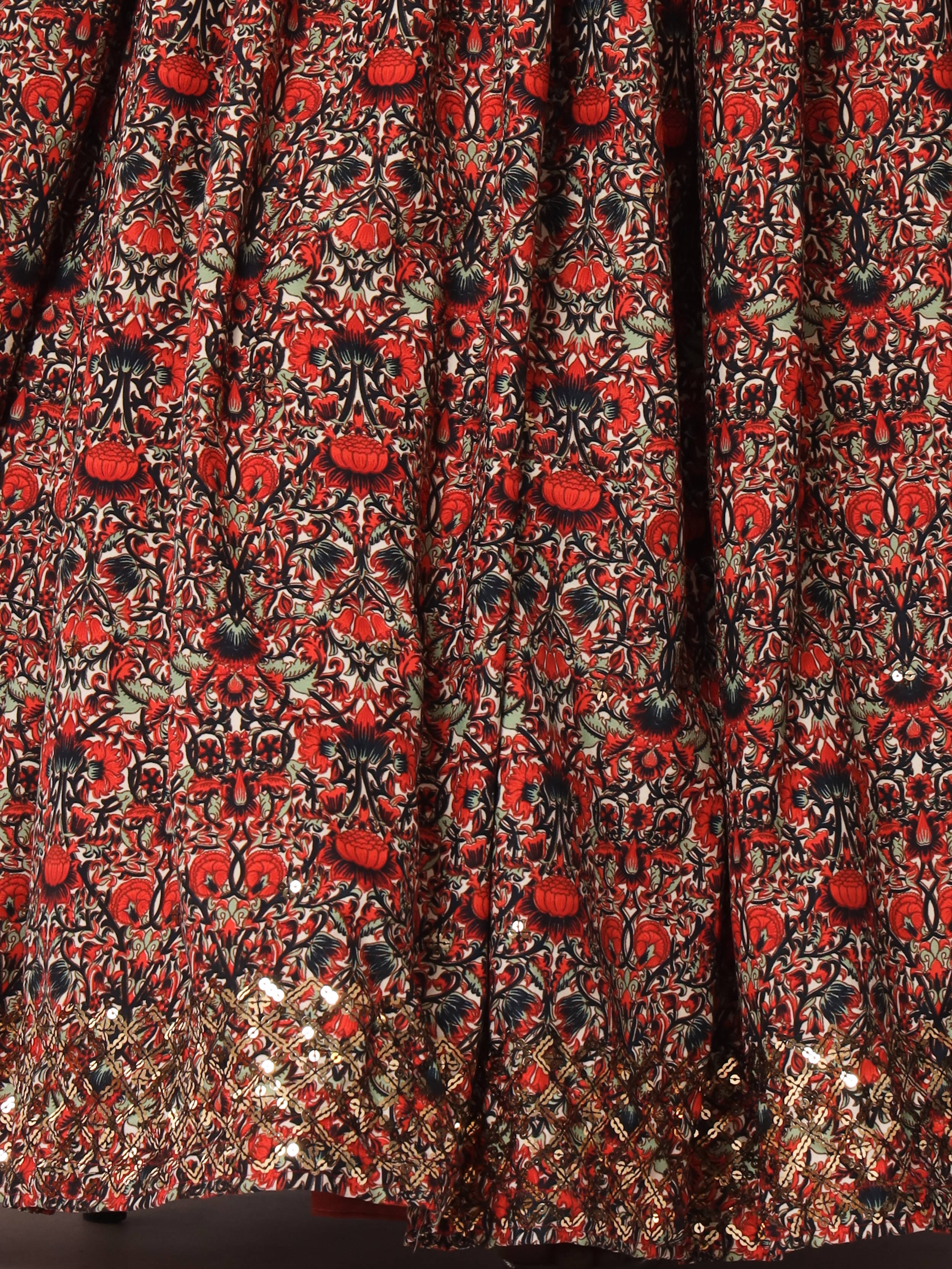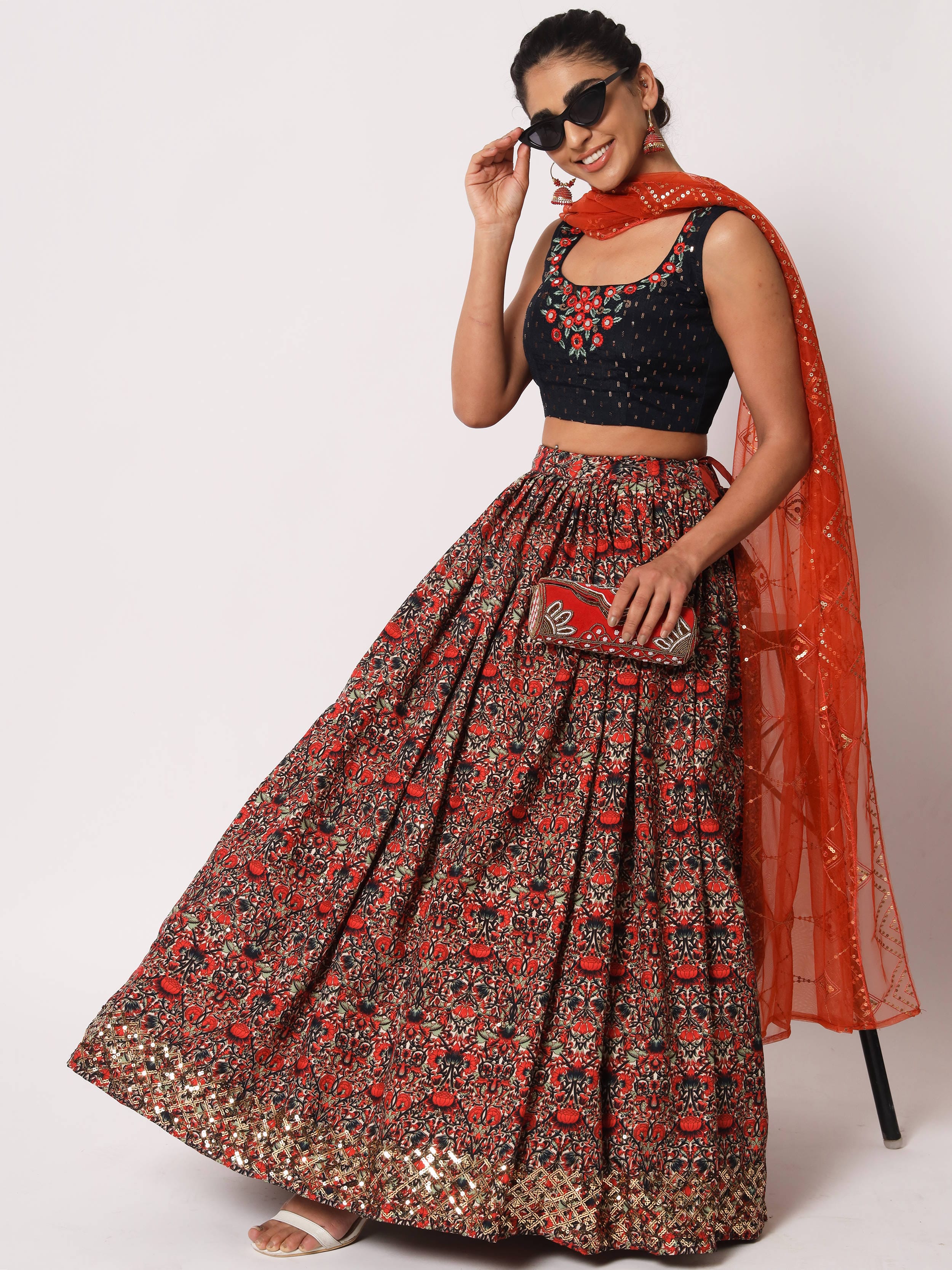 This printed lehenga comes with a navy blue color georgette material choli made with embroidery and sequin work. It also comes with red color net material dupatta made with thread embroidery and sequin work.