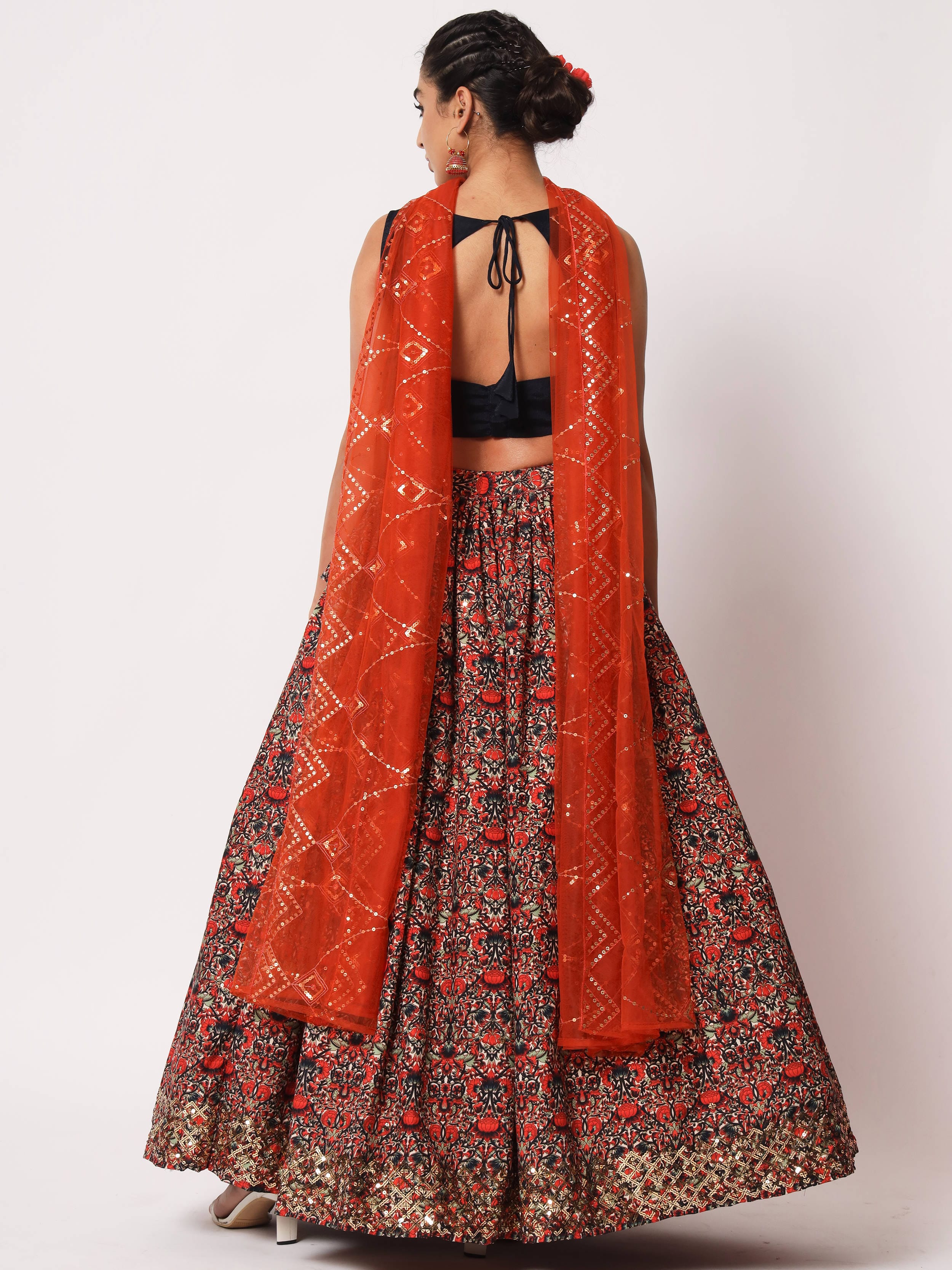 This digitally printed lehenga is semi-stitched and can be customized up to 42 inches. The choli will be fully unstitched material (0.80) and comes with 2.30 meters dupatta.