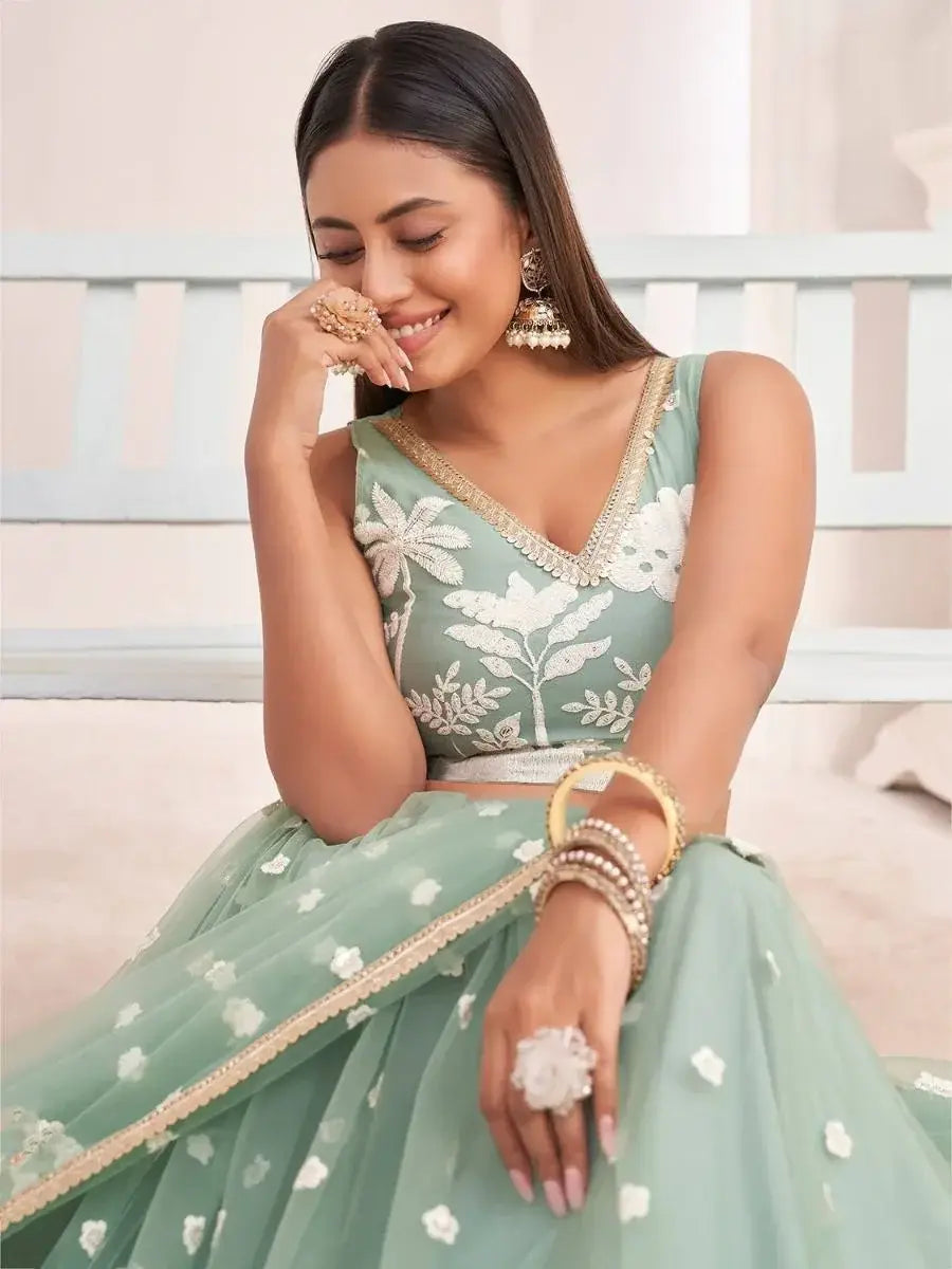 Drapes that influence your soul and infuse festive fragrance with this ravishing pista green color butterfly net fabric full flare lehenga made up of all-over white cotton floral thread butties and live natural look wonderful embroidered bottom layer work and comes with American crepe inner attached with can-can and canvas inside.