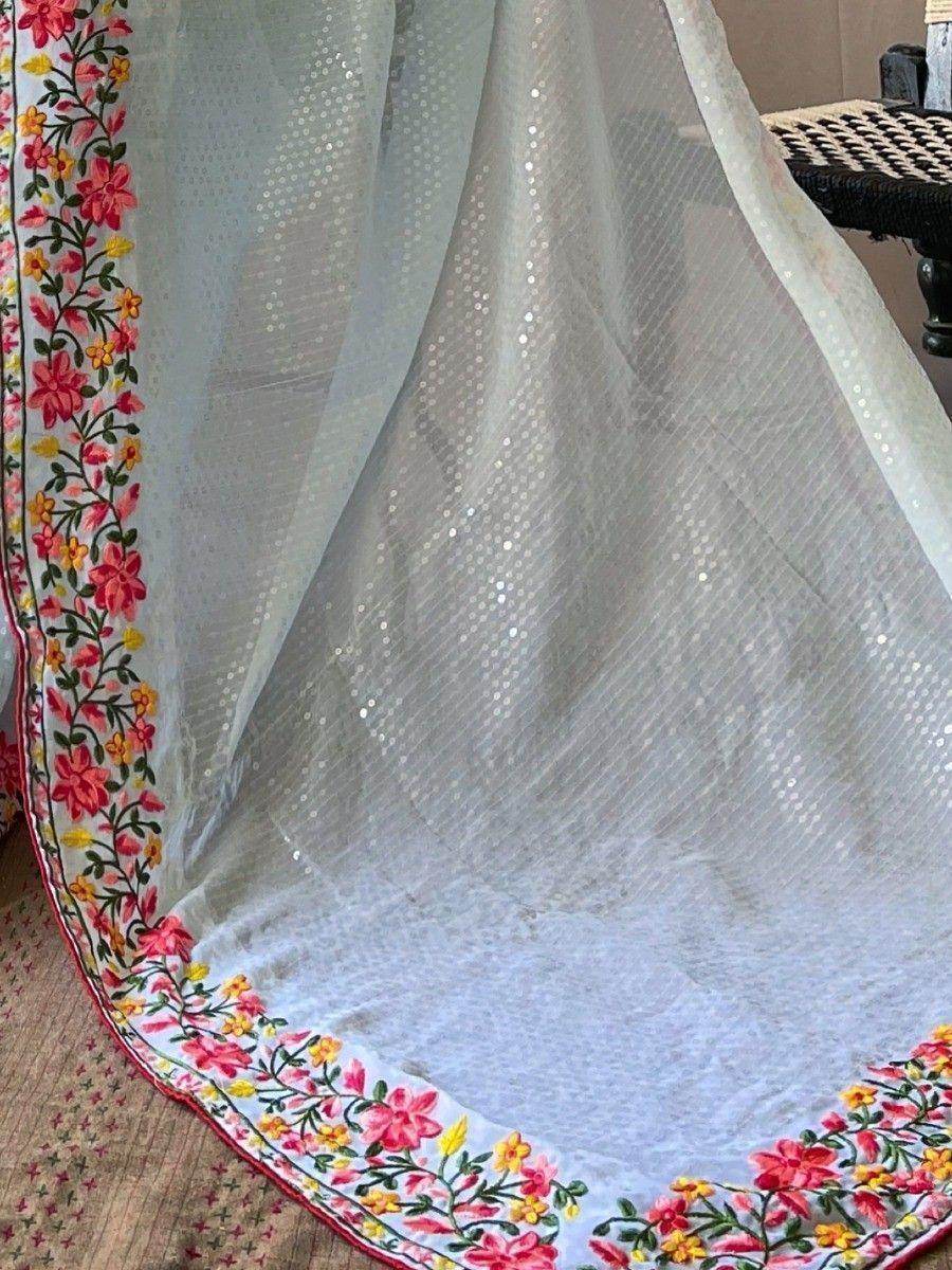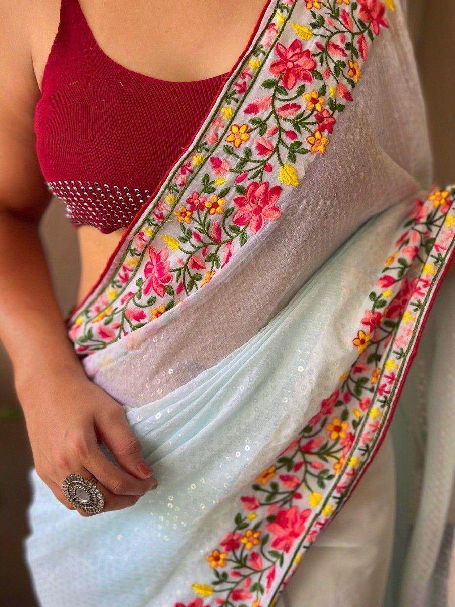 This saree is the stunning sequin work that highlights the beauty of the sky-blue fabric. The sequins add a touch of sparkle and glamour, making this saree a showstopper. The beautifully embroidered border work further enhances the overall look, creating a mesmerizing effect.