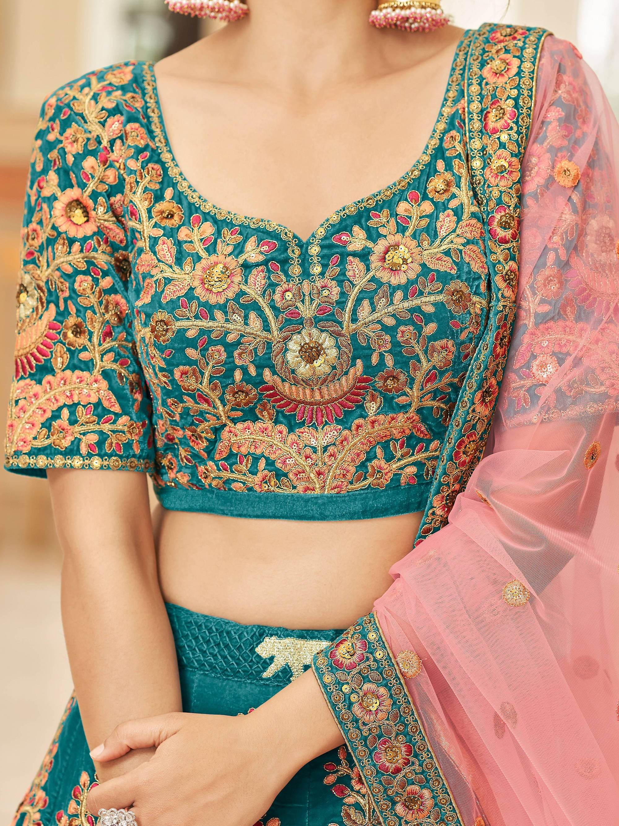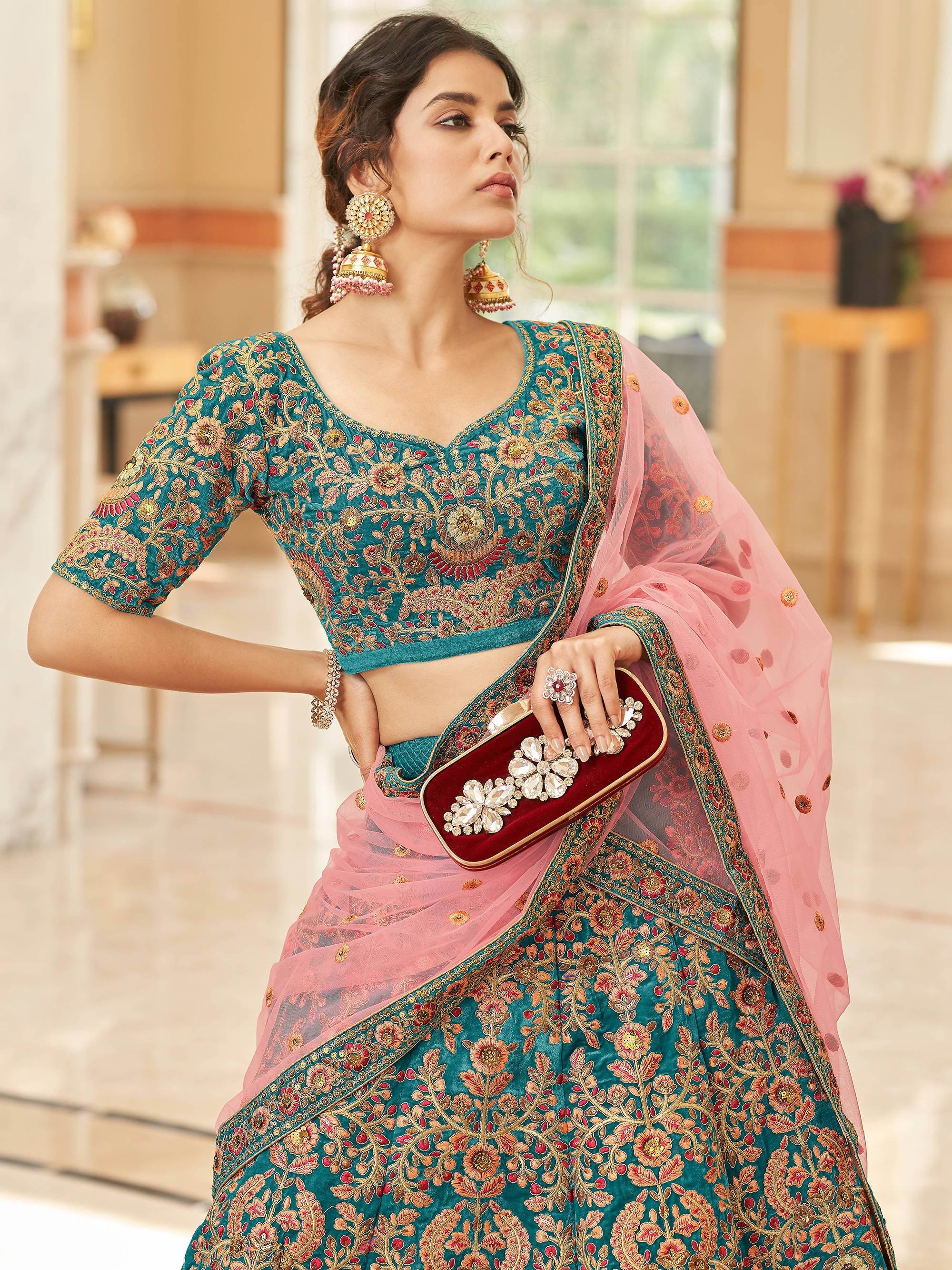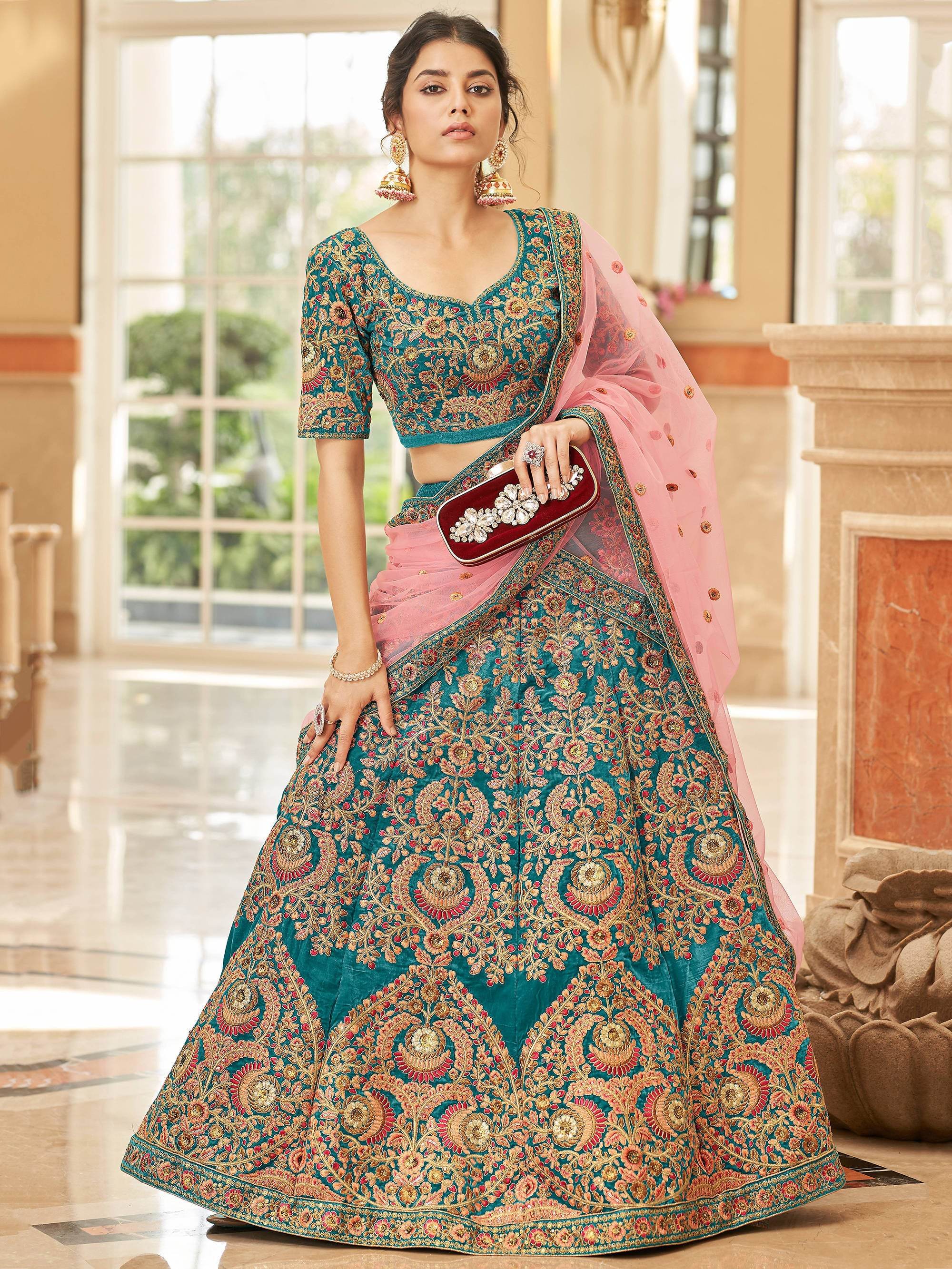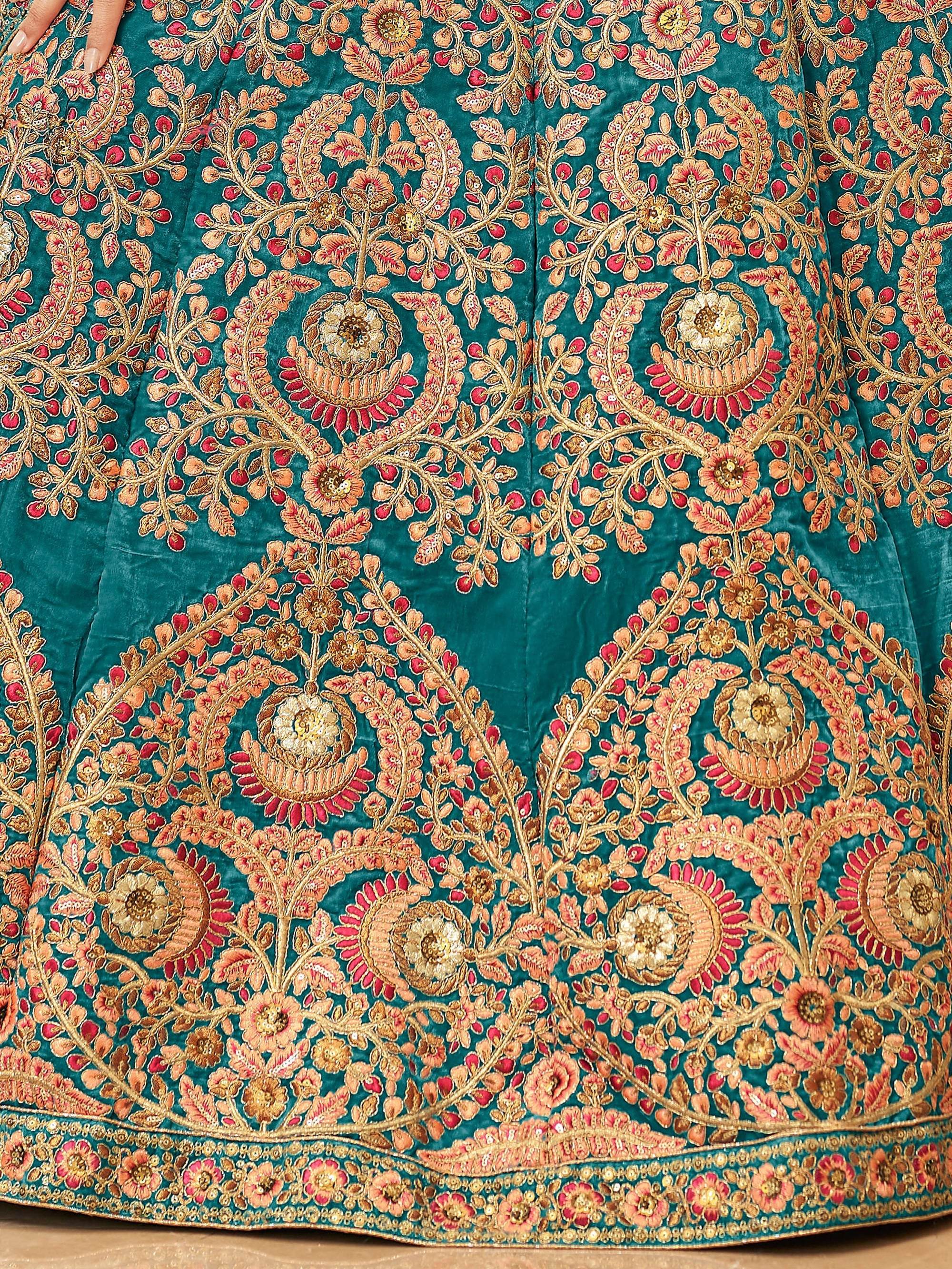 The Ravishing Teal Blue Heavy Embroidered Velvet Bridesmaid Lehenga Choli is the perfect choice for anyone looking for a show-stopping outfit that's both comfortable and luxurious. So why wait? Order yours today and prepare to turn heads at your next big event!