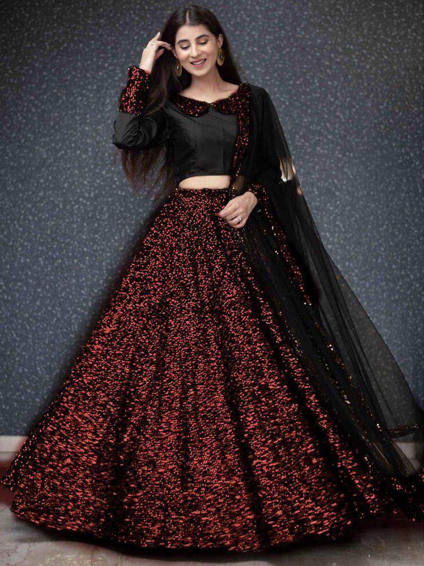 Stand out in the crowd by wearing this red colored lehenga in velvet embellished with sequins work all over.
