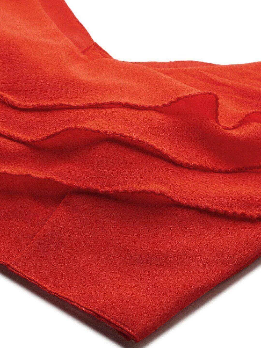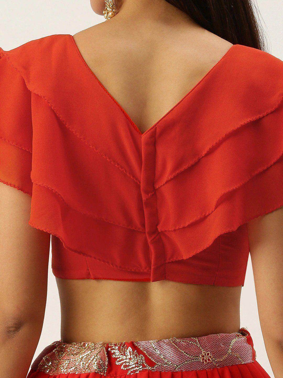 This lehenga comes with a similar color crop top in georgette material designed with a ruffle neck.