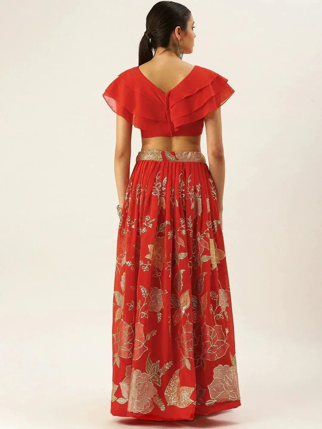 Create your occasional look more impressive enrobing this stunning red lehenga choli made of georgette material embellished by a thread and sequins embroidered work with hand-made heavy tassel.