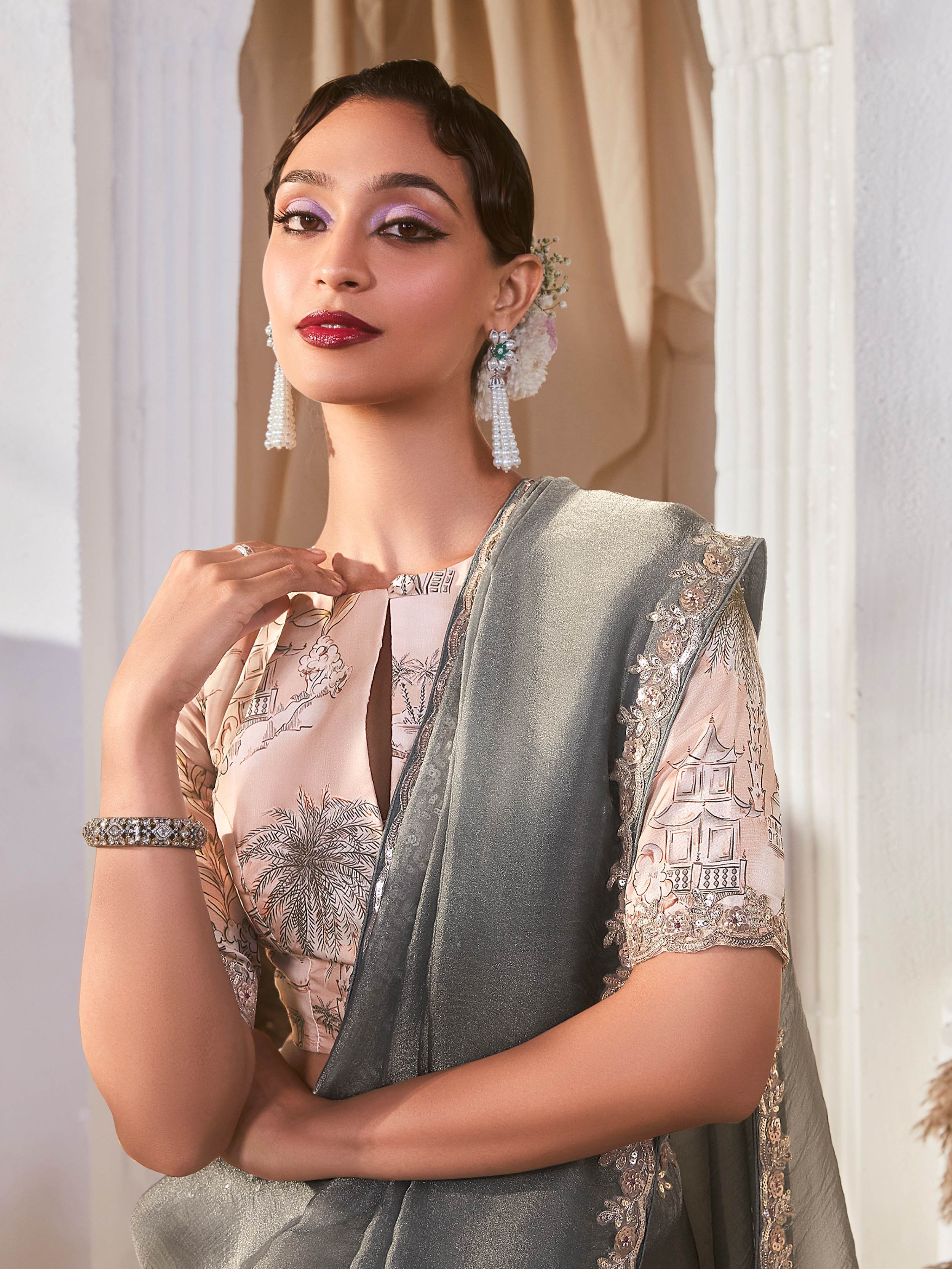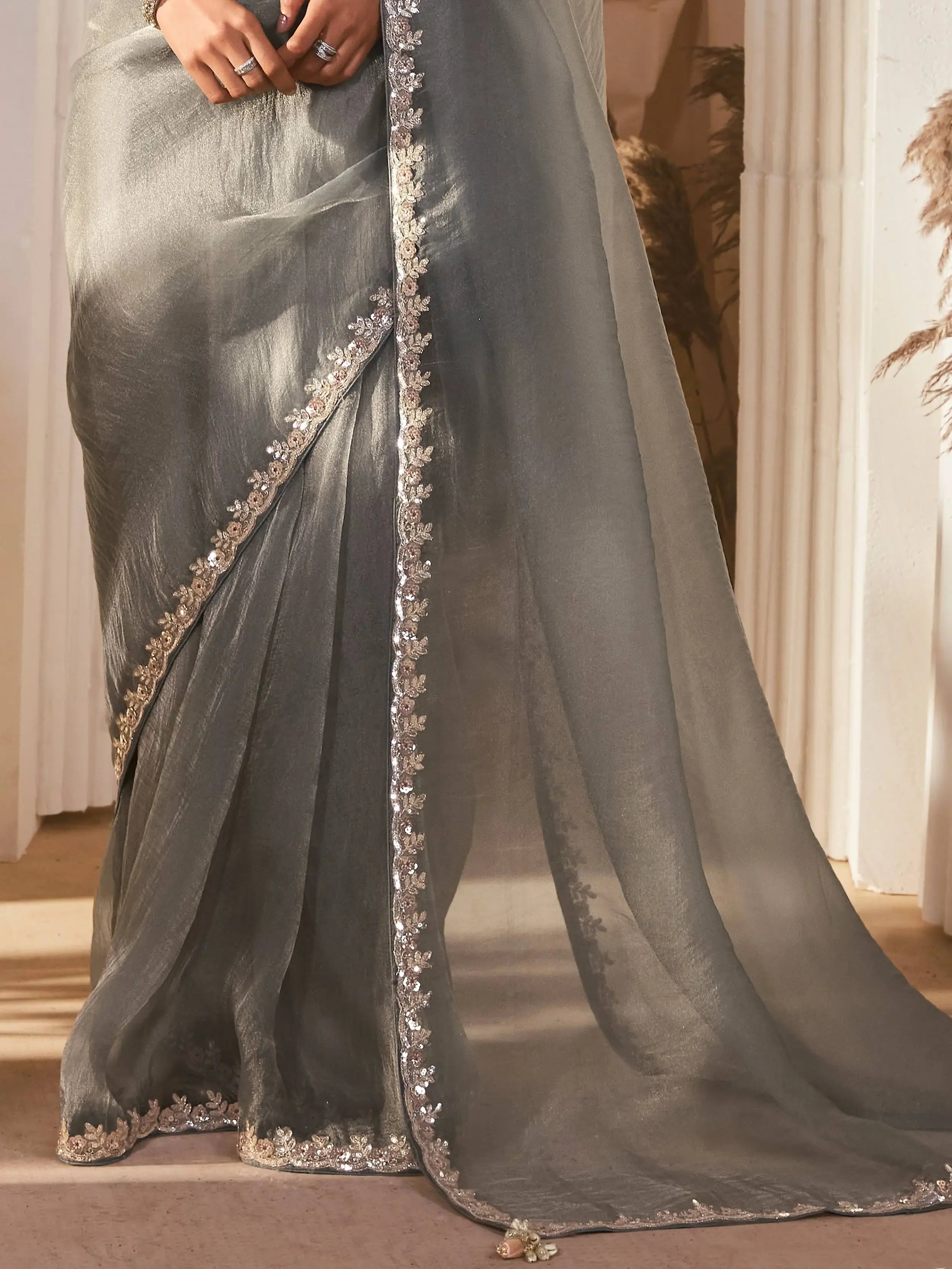 This organza saree is a graceful choice for party wear, blending elegance with fine craftsmanship. The light grey drape is highlighted with sequins and delicate thread work that runs along its ornate border, giving it a sophisticated charm.