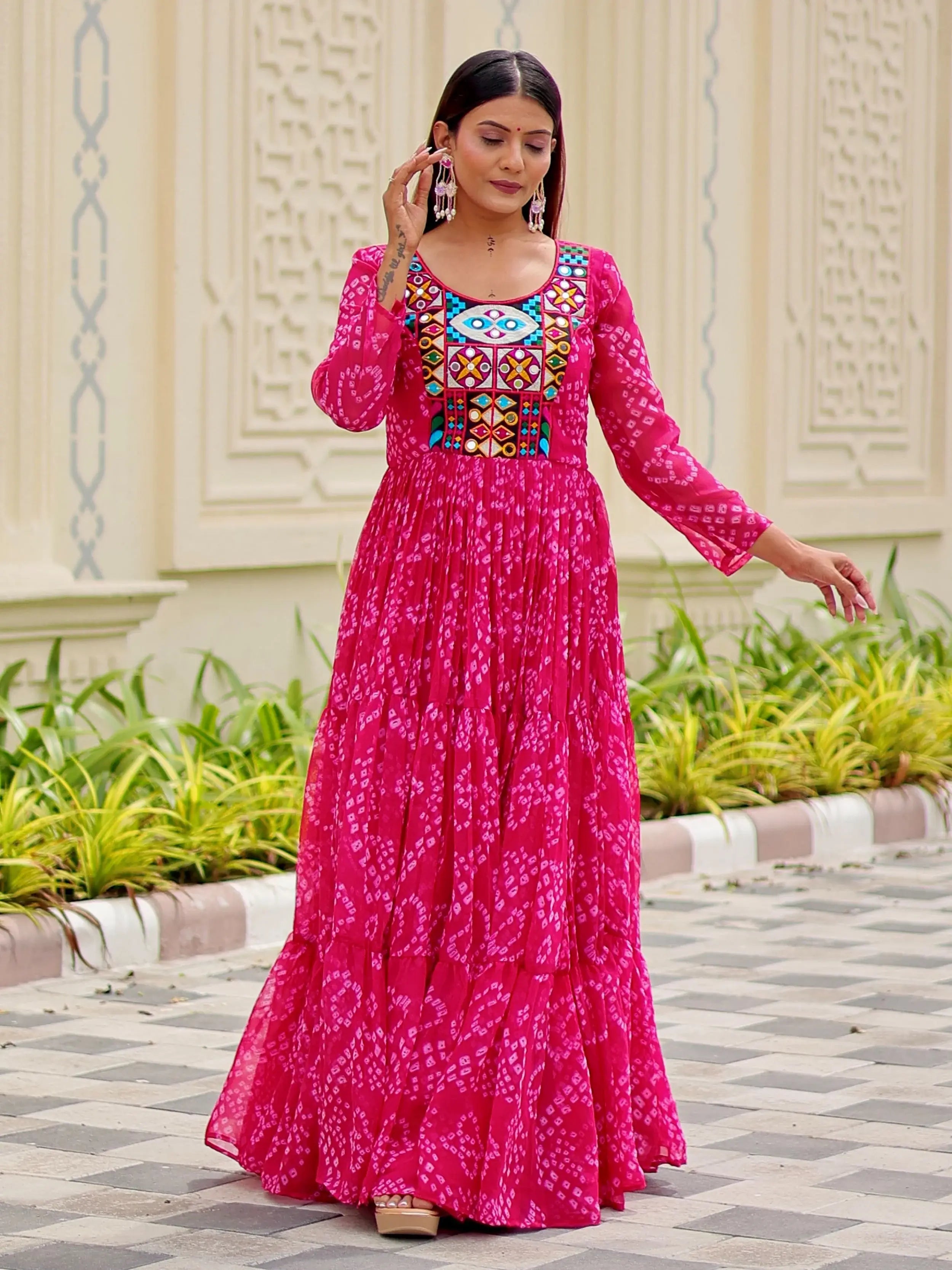 This vibrant pink georgette gown stuns with traditional Bandhani print and a flowing 9-meter flair that captures every twirl with elegance and grace. The lightweight fabric ensures fluid movement while maintaining festive appeal.