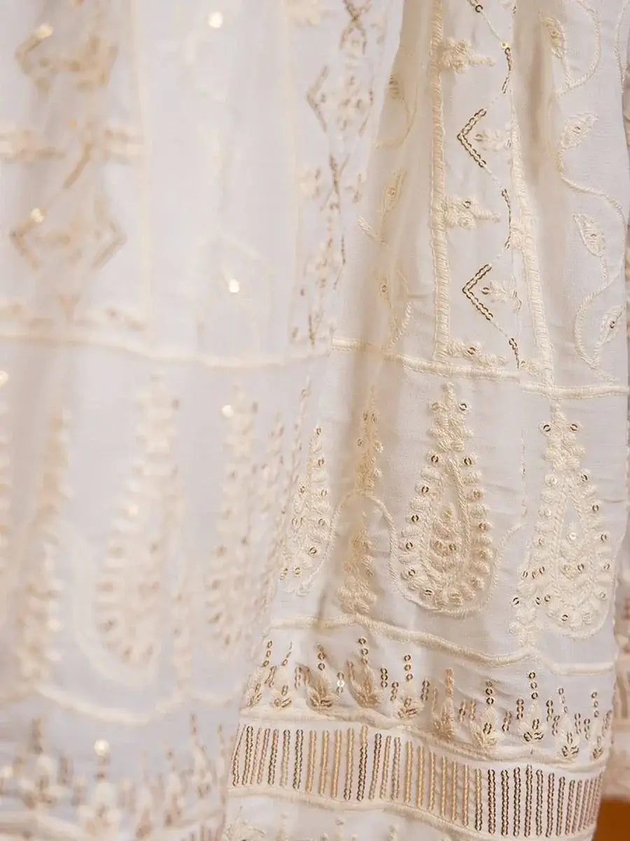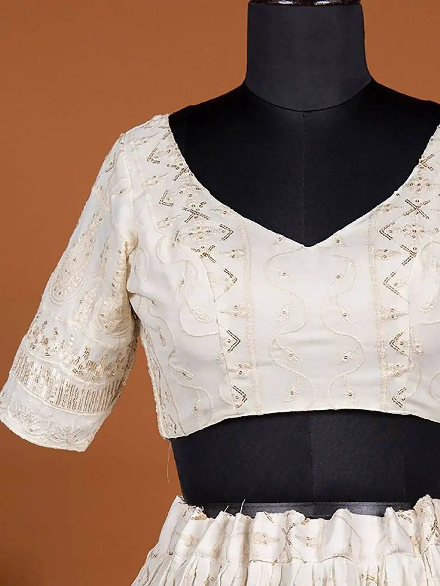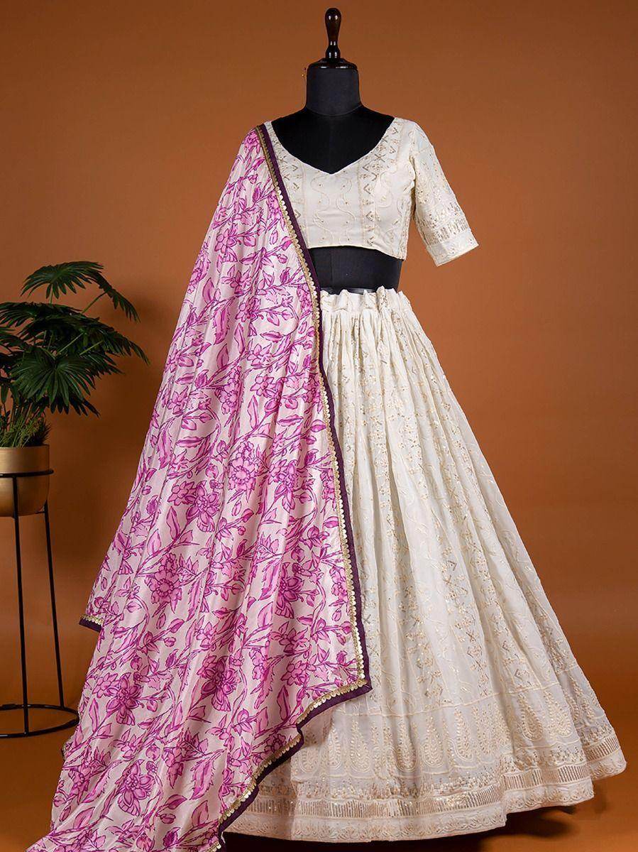 Wrapped up in the warmth of comfort and style, this pleasant white color lehenga made with georgette material accomplished with sequins work, and thread embroidery, and also has a cancan attached.