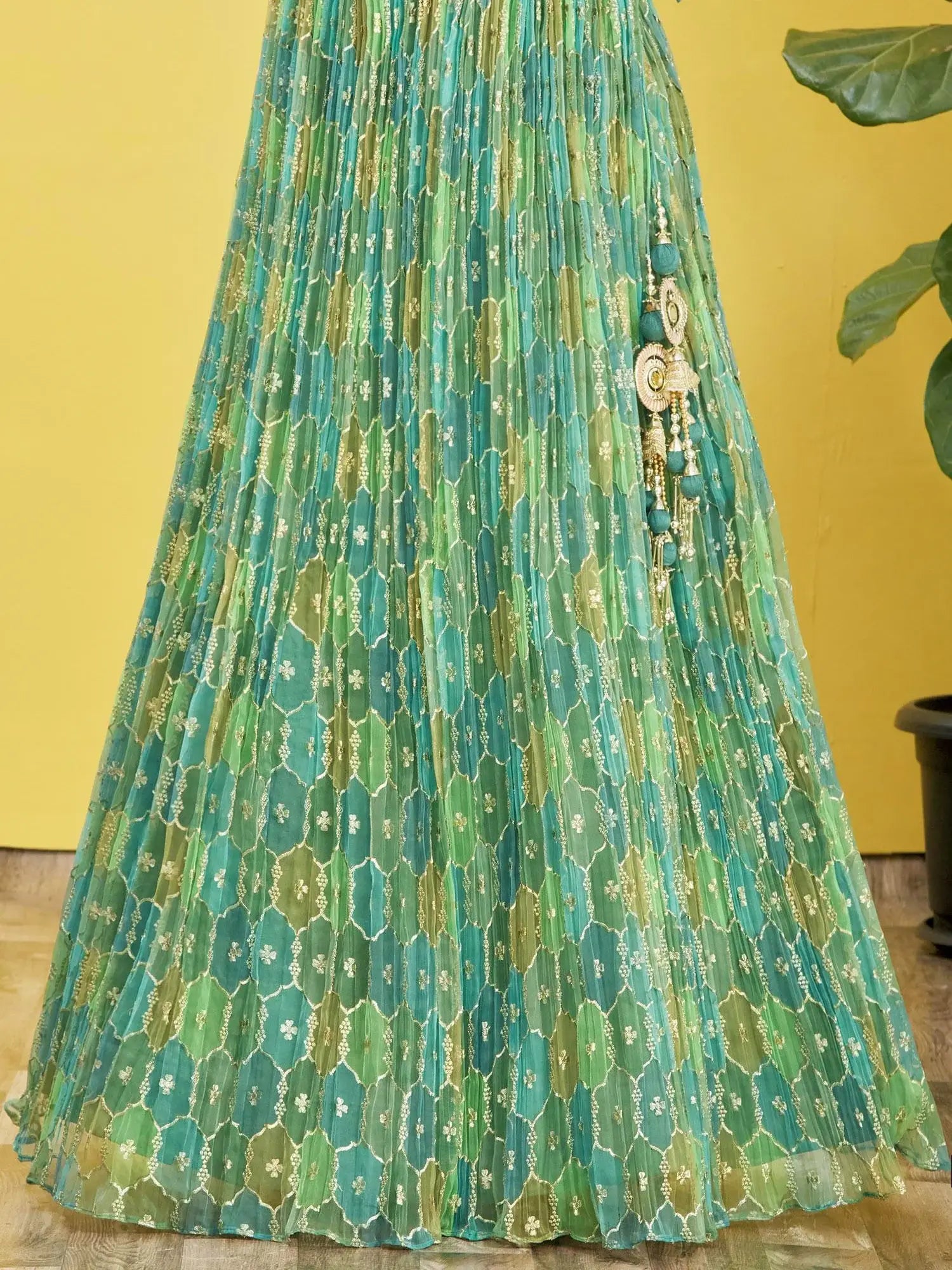 The green mirror work organza mehendi lehenga choli is an exceptional addition to your wardrobe, suitable for a range of occasions including Bollywood events, cocktail parties, receptions, evenings out, festivals, and of course, mehendi ceremonies. Its elegant silhouette in an A-line shape adds grace to your movements and enhances your feminine charm.