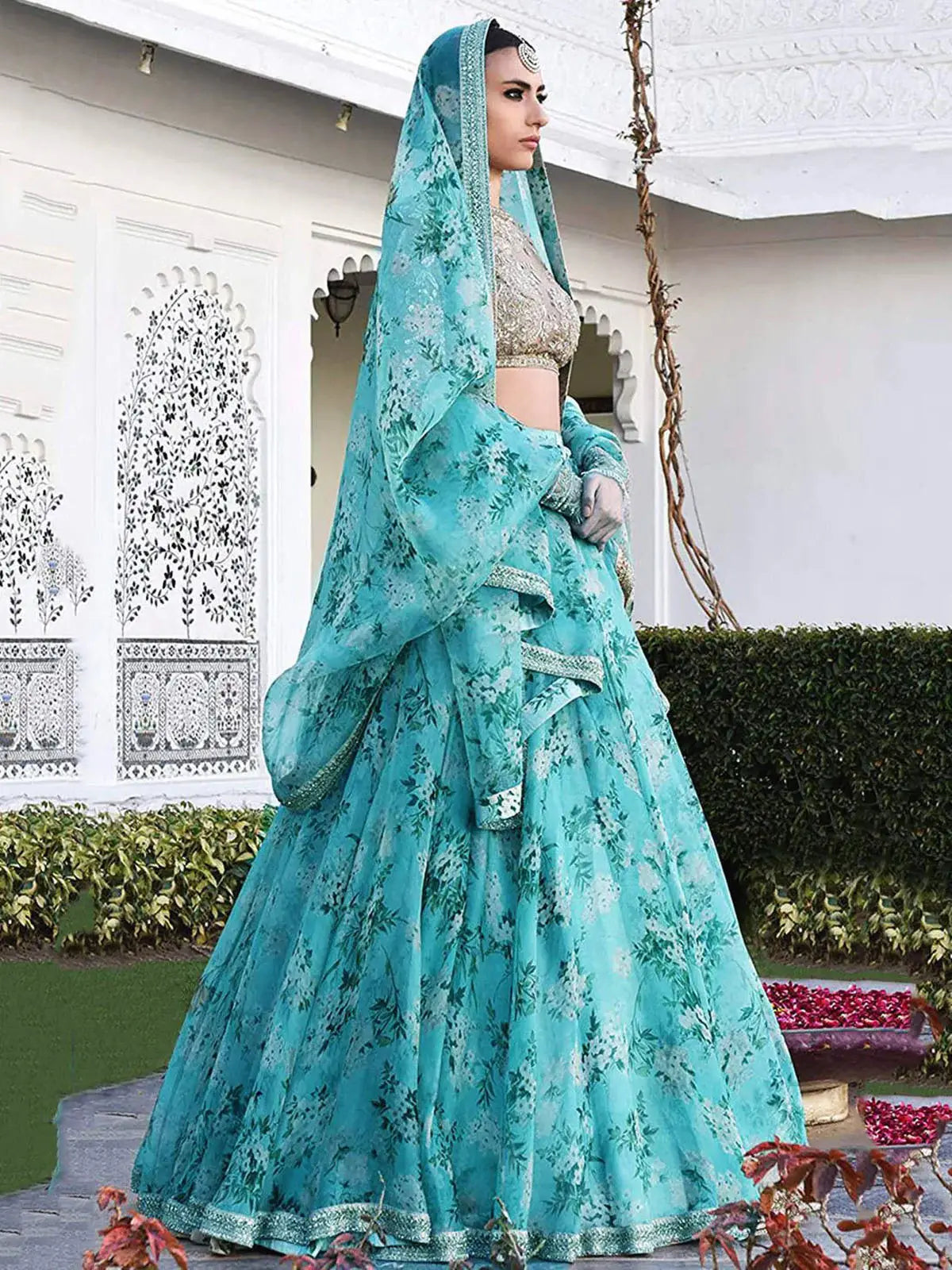 Look super gorgeous in this sky blue flared blue colored organza silk bridal sabyasachi designer girlish lehenga beautified with floral digital print all over.
