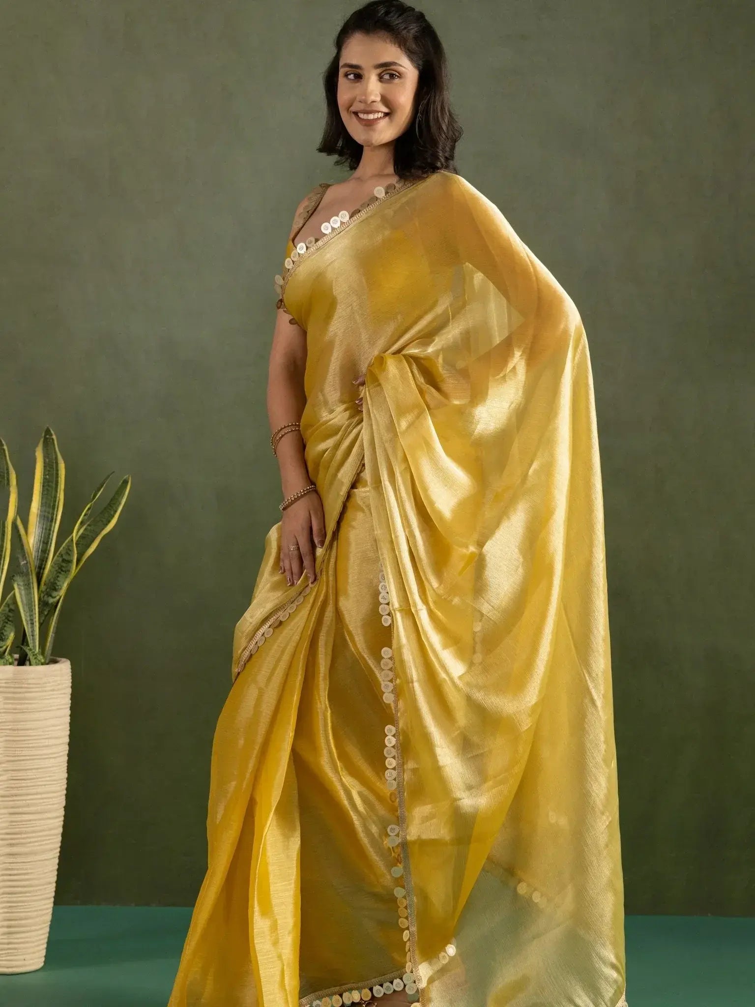 Step into effortless elegance with this pre-stitched yellow chiffon saree, crafted for modern grace. The ready-to-wear drape ensures you shine without the hassle of pleating.