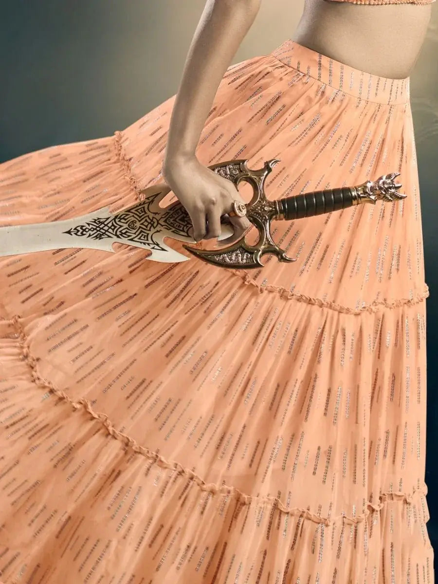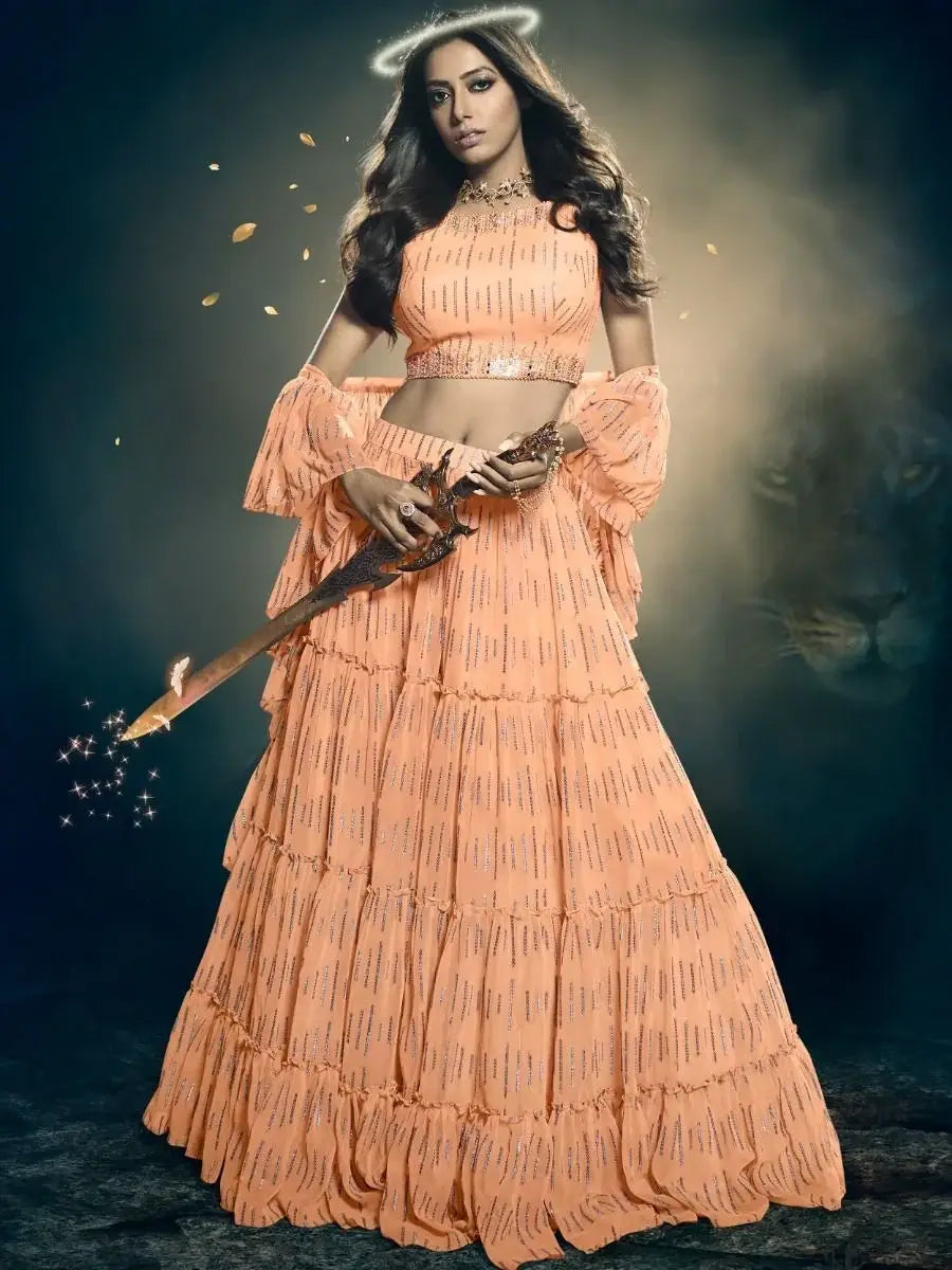 With our sparkling orange sequin work art silk special occasion lehenga choli, you can experience the true essence of Indian ethnic fashion. The A-line silhouette/shape adds a flattering touch to your figure, while the round neck and sleeveless design add a modern twist to the traditional style.