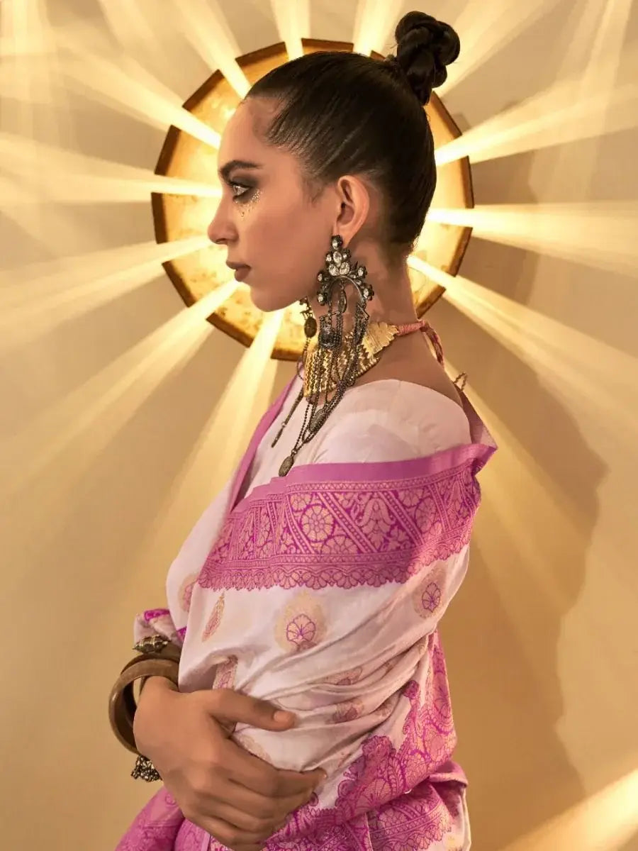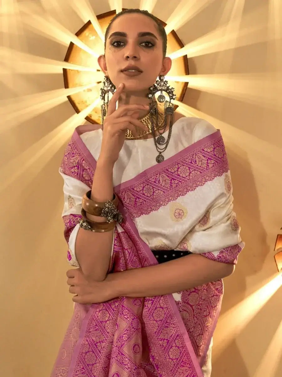 This spectacular white zari-weaving handloom silk saree is the epitome of elegance and grace. It is a timeless piece that speaks volumes about the rich heritage and craftsmanship of India. Whether you're attending a wedding, engagement, or reception, this saree is guaranteed to make a lasting impression. Showcase your traditional and royal look with this enchanting designer zari-weaving silk saree collection.