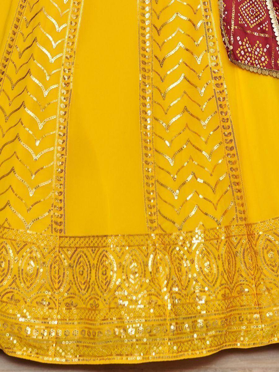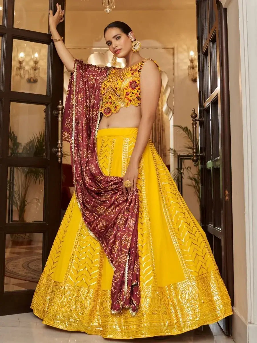 Present an energetic highlight to your ethnic attire by donning this lovely yellow color lehenga crafted with georgette fabric completed with sequins work and thread embroidery.