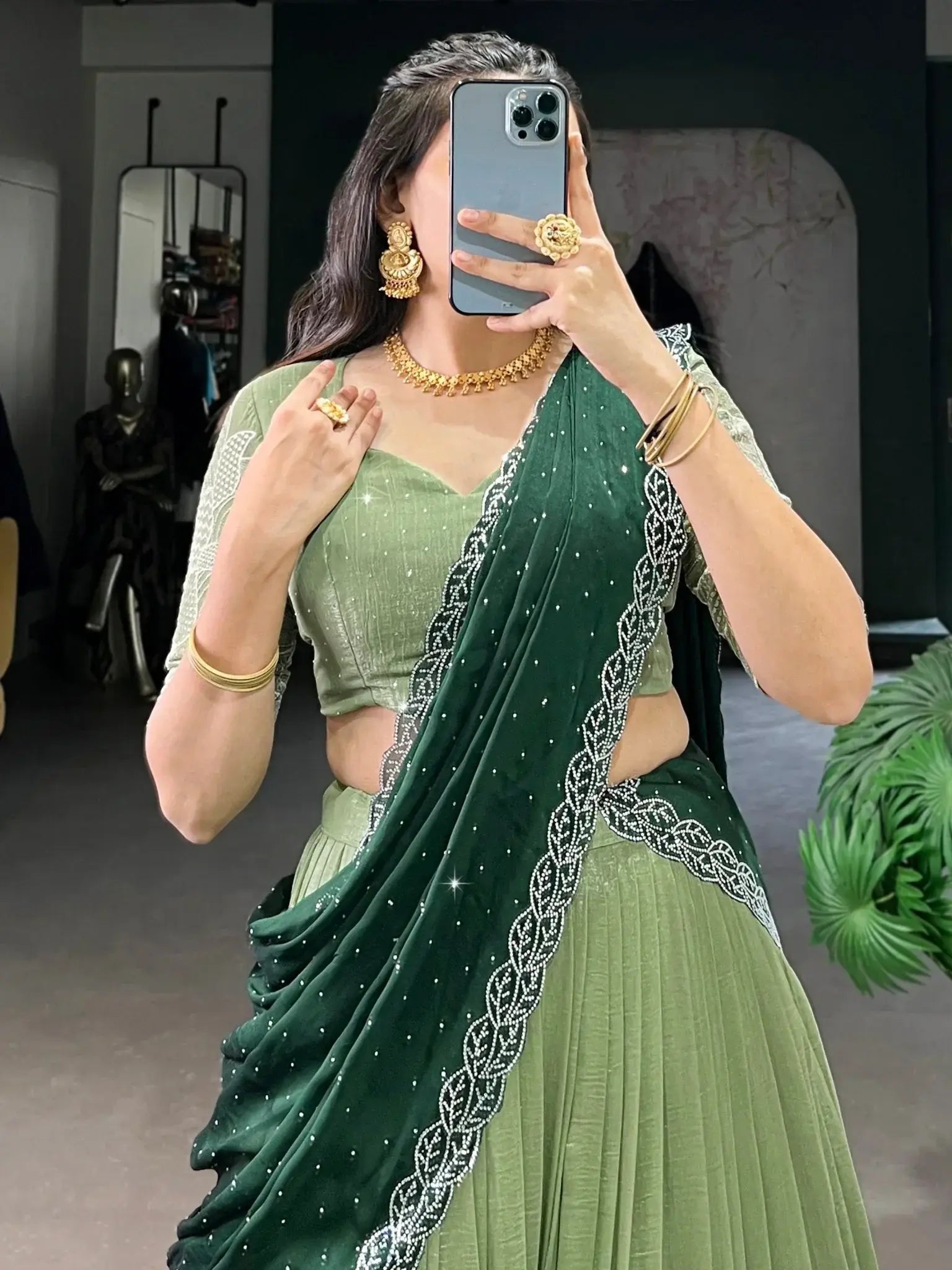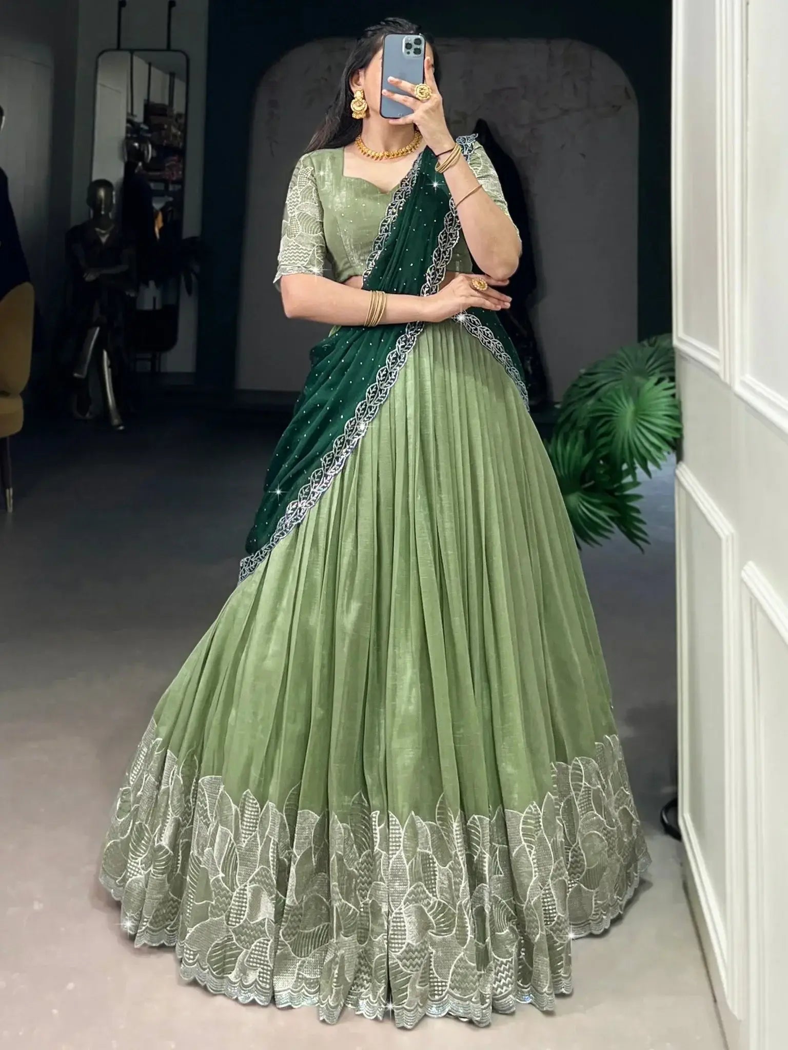 A contrasting bottle green silk dupatta completes the ensemble, highlighted with beautiful Mukkai Hotfix and fine cutwork edging. This rich shade adds depth to the soft pista green, creating a balanced and striking appearance perfect for pre-wedding celebrations.