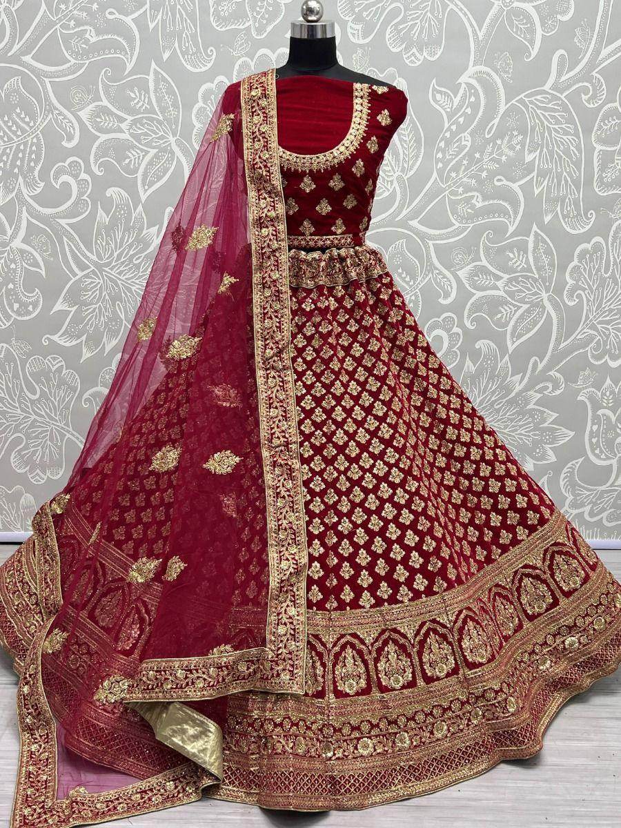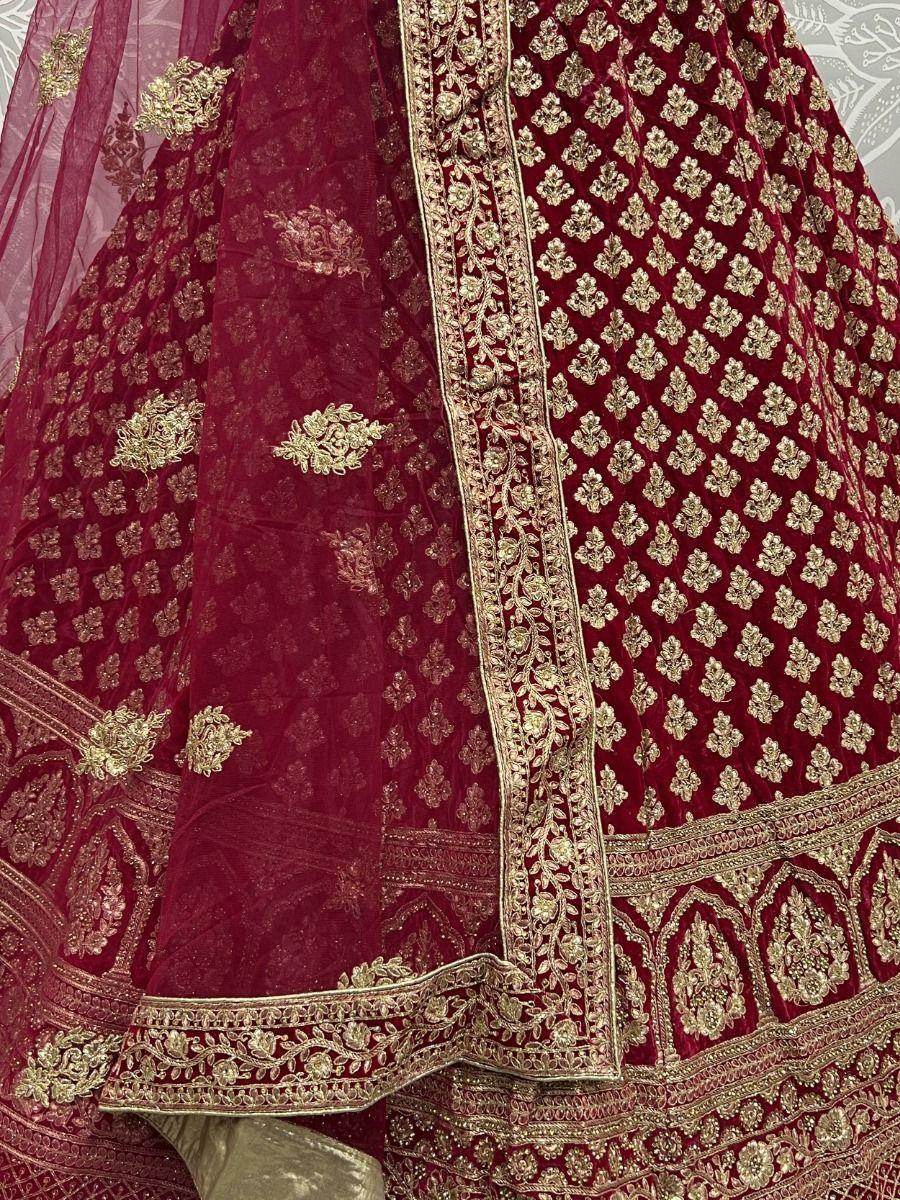 This gorgeous red bridal lehenga paired up with red velvet color choli in heavy embroidery work material with similar color dupattas to adorn you more classy.