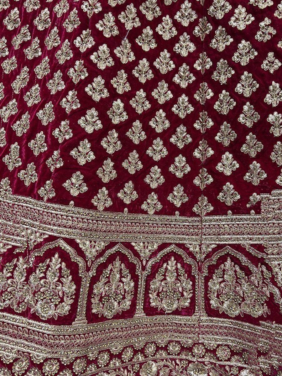 This velvet lehenga is semi-stitched and can be customized up to 42 inches, also have a cancan and canvas attached. The choli will be un-stitched material (1.2 meters).