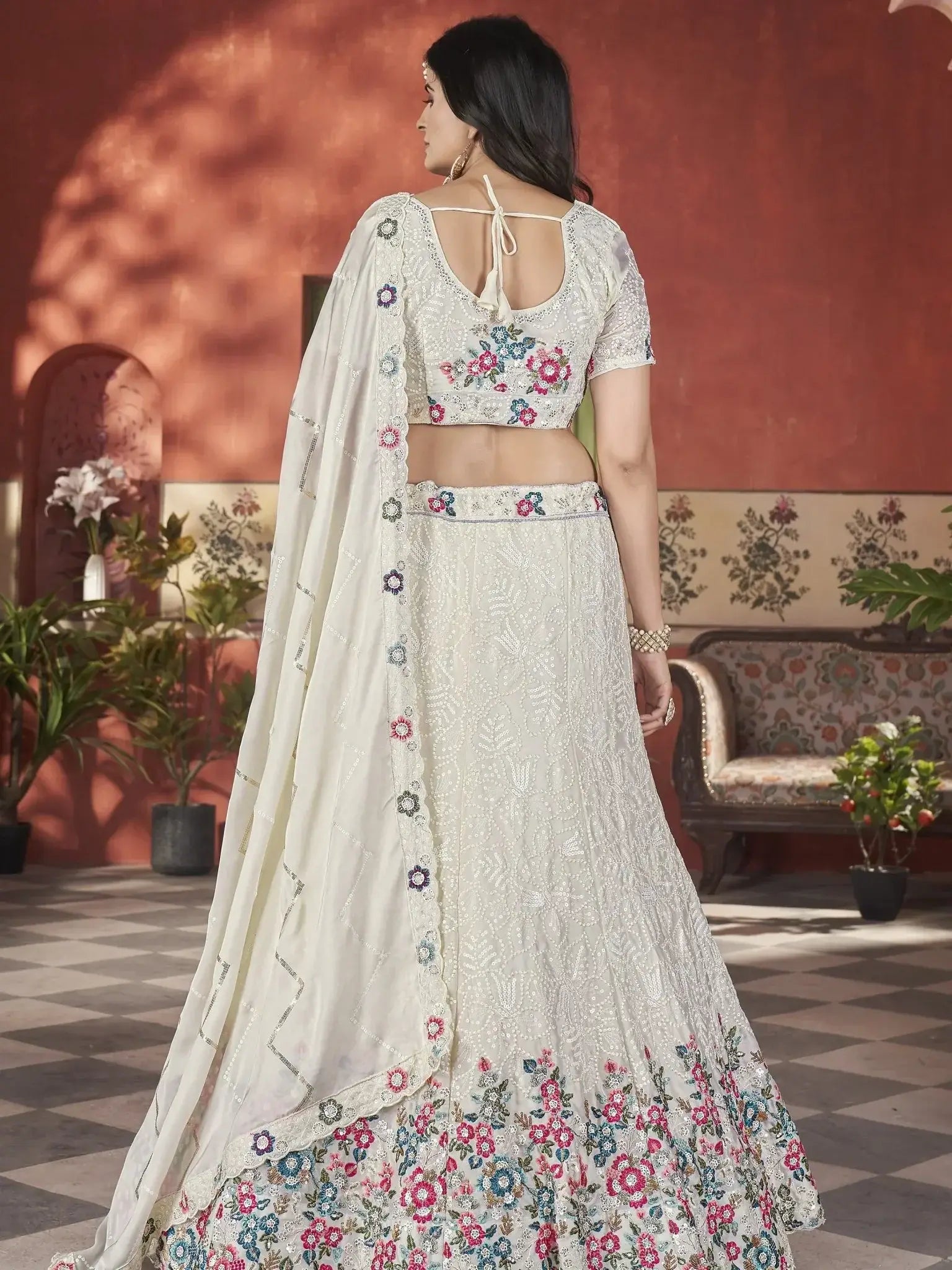 This exquisite ensemble features a beige color chinon lehenga adorned with intricate thread and floral embroidered work, as well as shimmering sequin detailing. The matching chinon choli and georgette dupatta also showcase the same beautiful embroidery and sequin work, finished off with attractive lace detailing for an extra touch of elegance.
