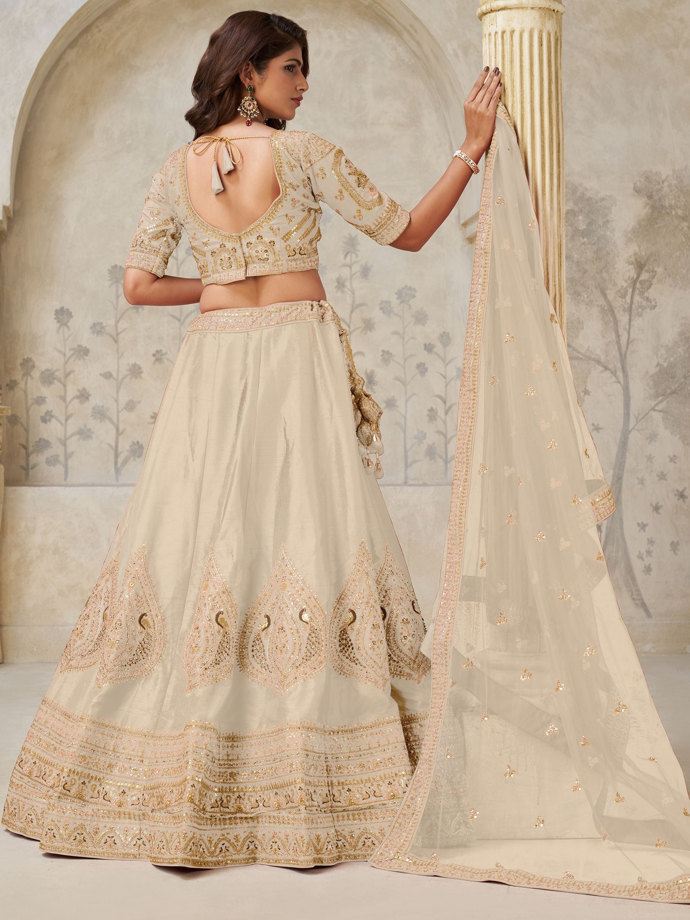 This elegant cream lehenga captures timeless sophistication with its soft, luxurious hue and intricate golden embroidery. The fabric glows with fine zari and sequins work, beautifully arranged in traditional motifs along the border.