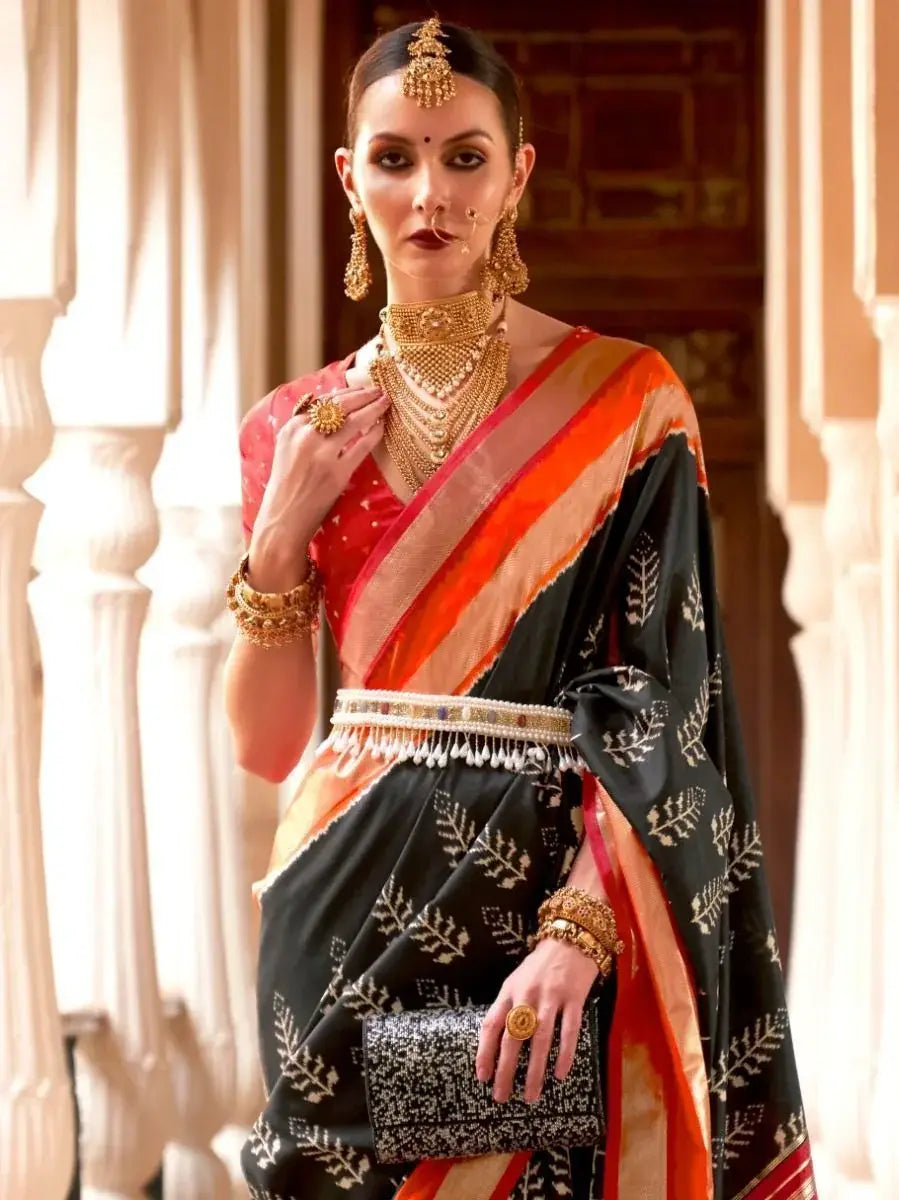 The saree and blouse are elegantly designed, retaining the traditional essence of Indian ethnic wear. The black patola silk fabric enhances the beauty of the ensemble, giving it a touch of sophistication.