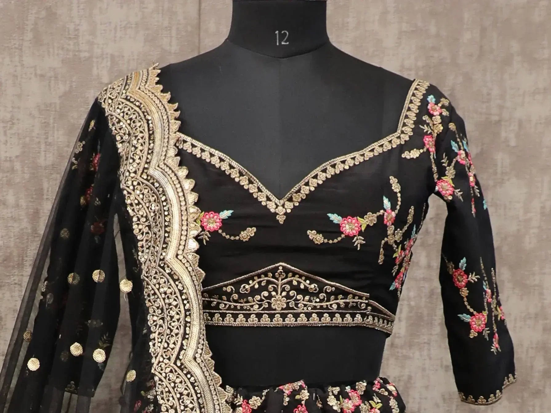 This chinnon silk black color lehenga is semi-stitched and can be customized in up to 42 sizes.