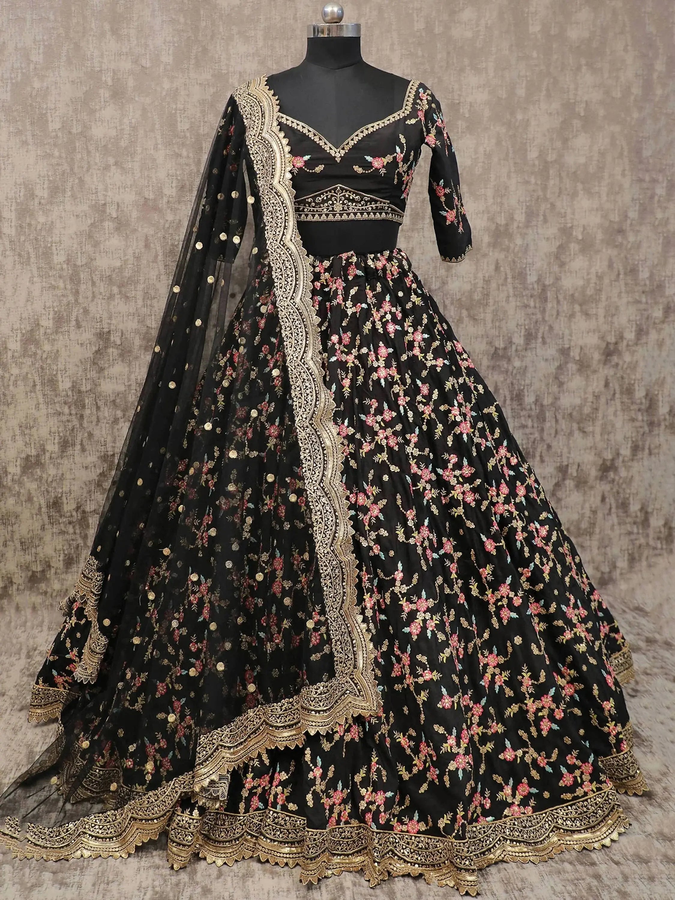 Be an absolute royalty by adorning this stunning black color chinnon silk material with colorful floral work lehenga embellished with thread, embroidered work, and zari sequins work, with butter crepe inner with umbrella flair attached with can-can and canvas inside.