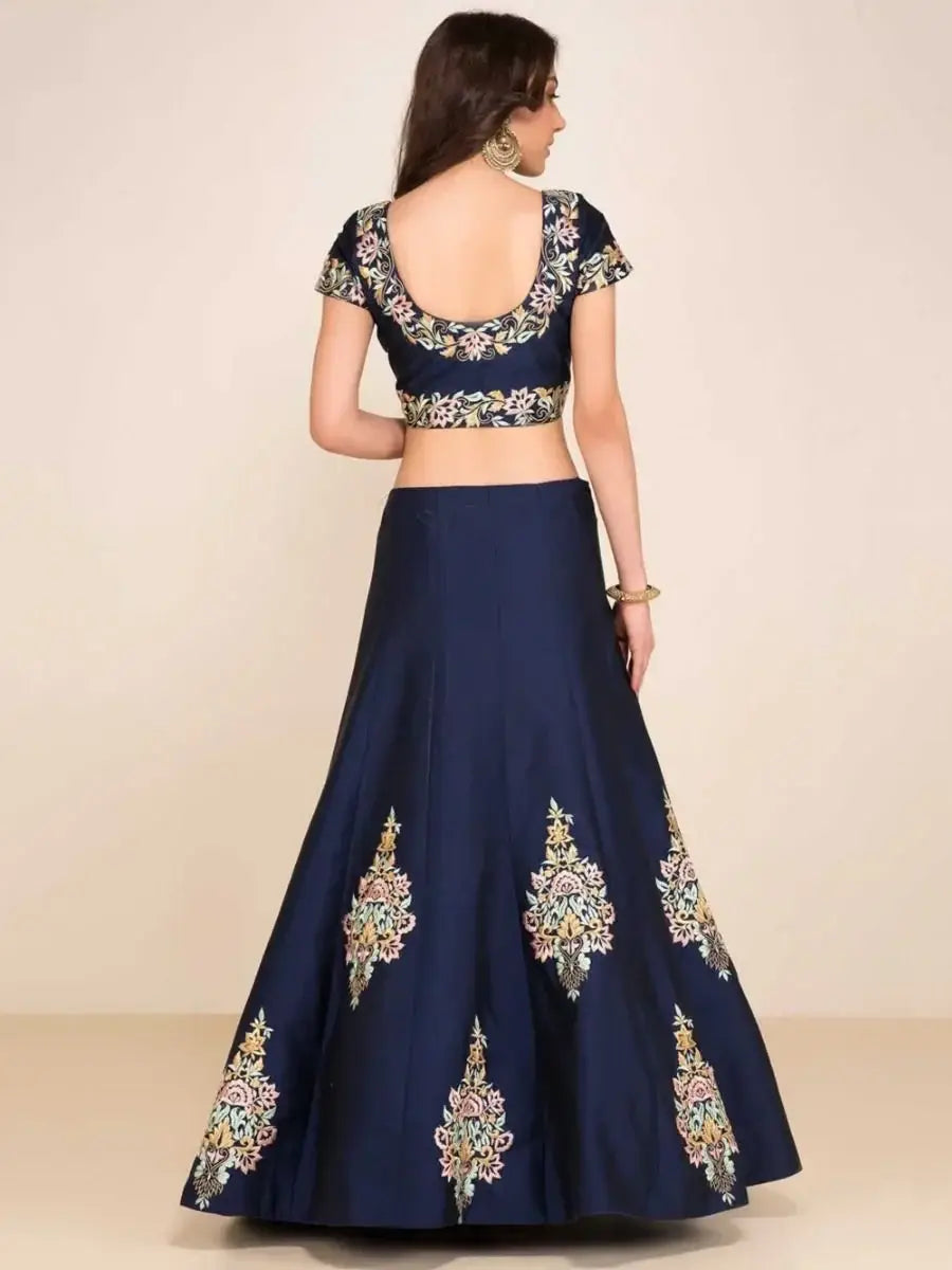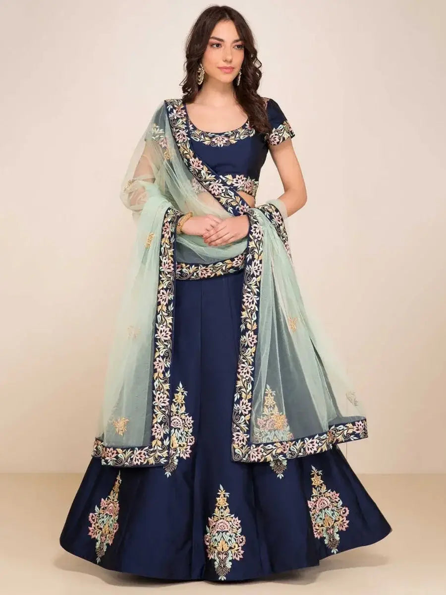 The benefits of choosing our blue embroidered silk wedding lehenga choli with dupatta are endless. The tapeta silk material of the lehenga and choli offers a luxurious feel and a beautiful drape. The floral embroidered work adds a touch of elegance and sophistication, making it perfect for weddings and other important events. The contrasting color net dupatta with four side floral embroidered lace border work adds a graceful touch to the overall look.