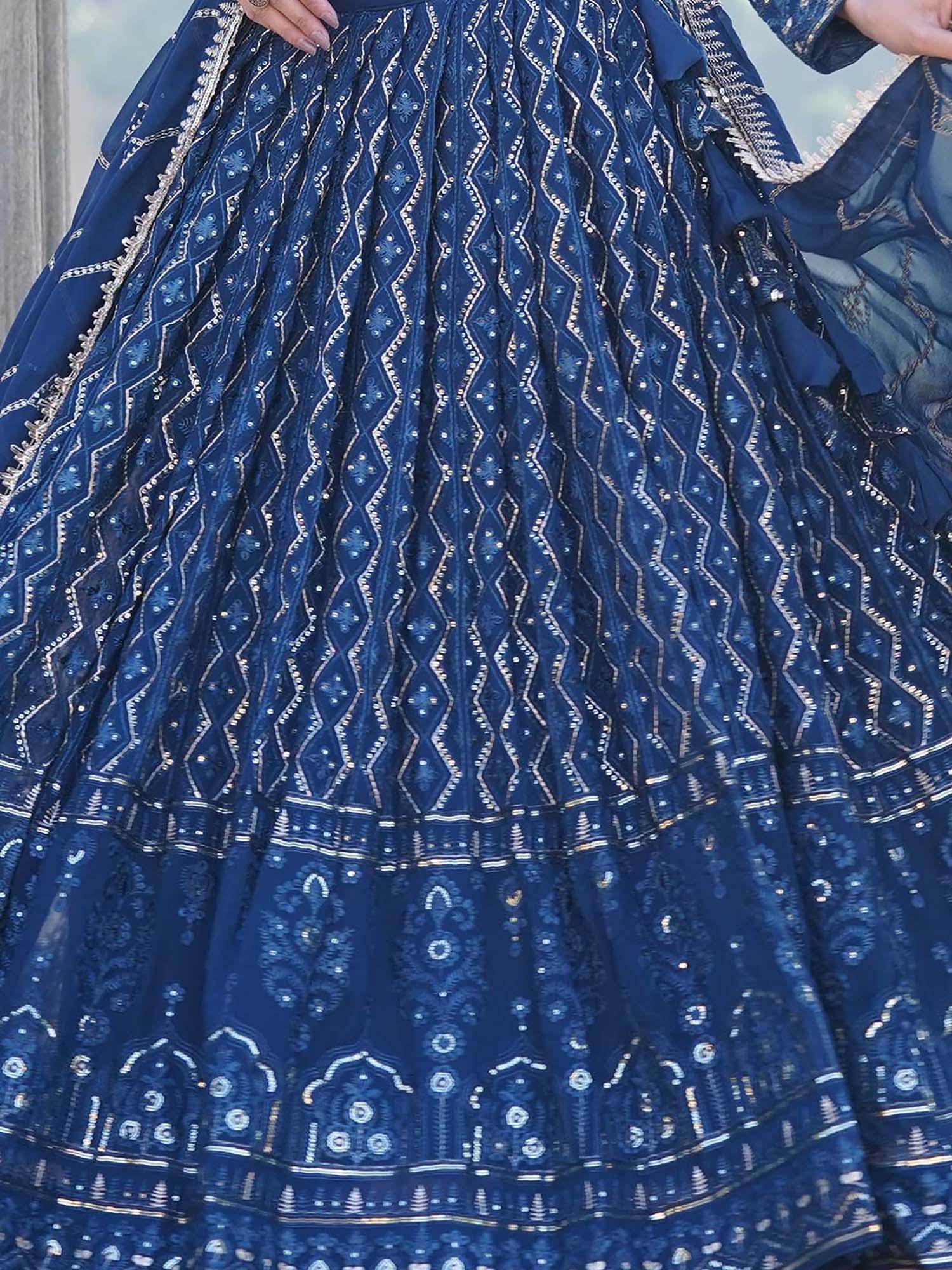 Elegance meets sophistication in this stunning blue georgette lehenga ensemble, embellished with heavy sequin and thread embroidery. The lehenga boasts a breathtaking 3.5-meter flair, ensuring a graceful and enchanting look for any occasion. Adorned with meticulous sequin work and intricate thread embroidery, this ensemble exudes timeless beauty and charm, capturing the essence of traditional craftsmanship and modern style.