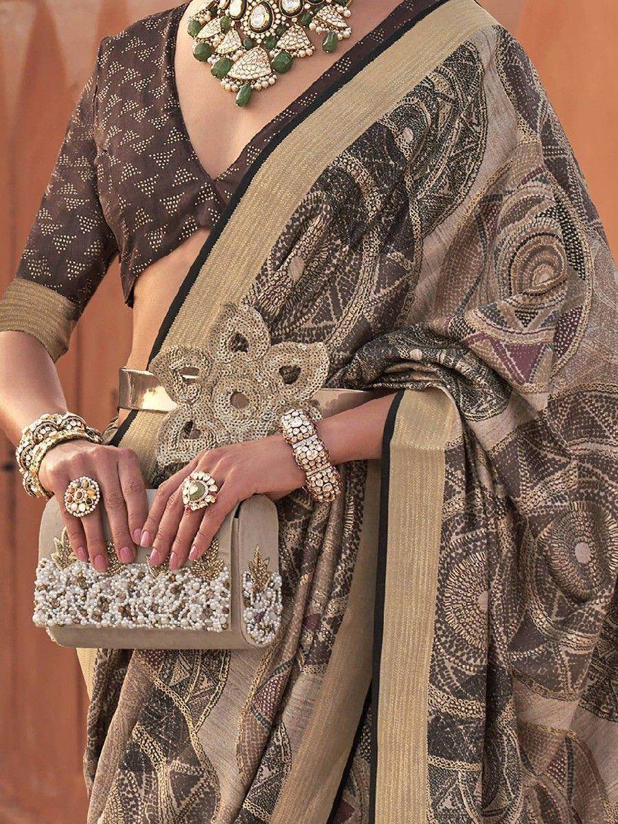 The stunning brown digital printed silk reception wear saree with a blouse from Ethnic Plus is a must-have addition to your ethnic wear collection. Its beautiful brown color, silk material, digital print work, and versatile design make it a standout choice for any special occasion.