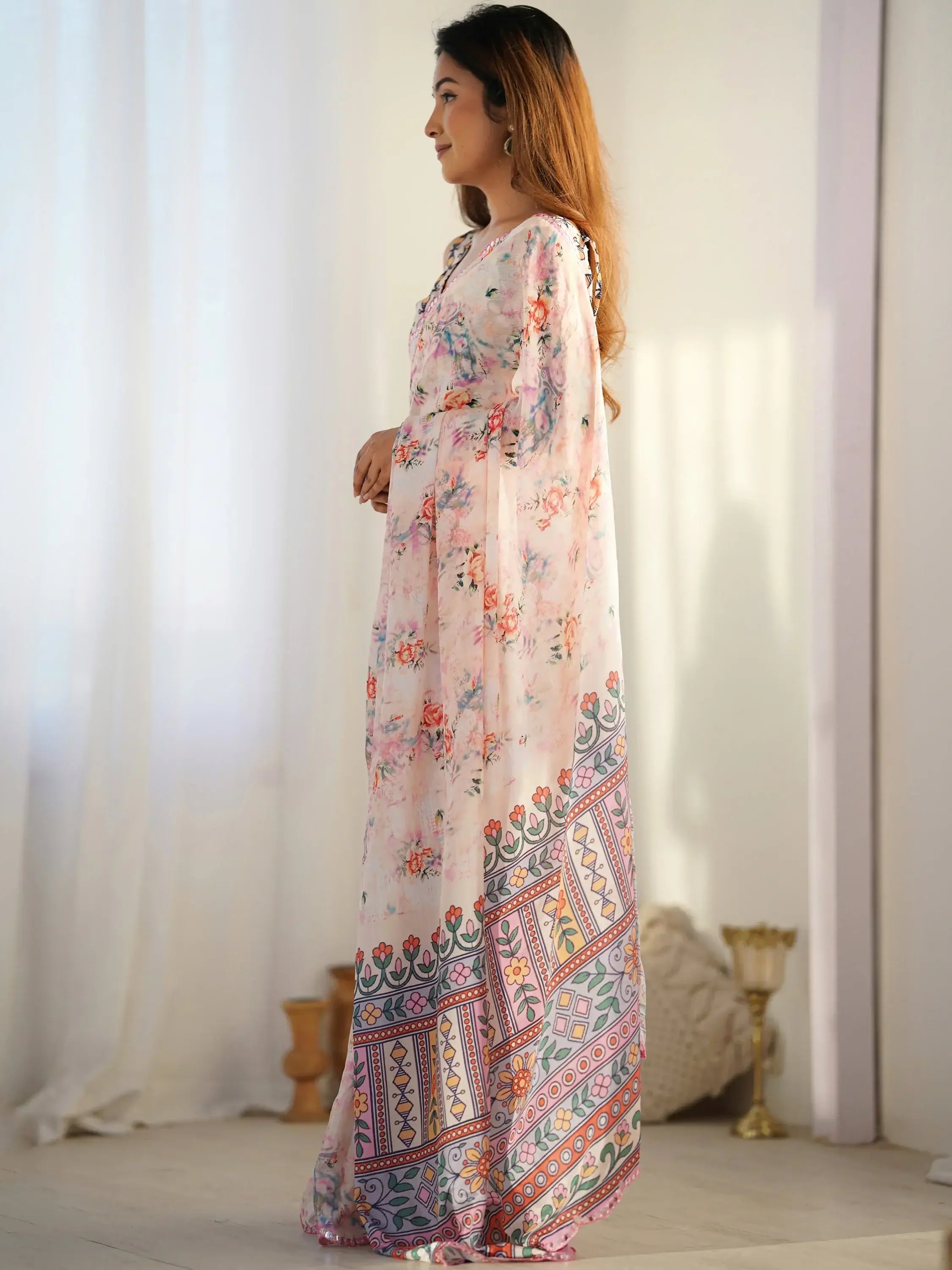 This exquisite saree is designed with intricate floral and digital prints, along with mirror-cut border work, adding a touch of elegance and sophistication to your ethnic look.