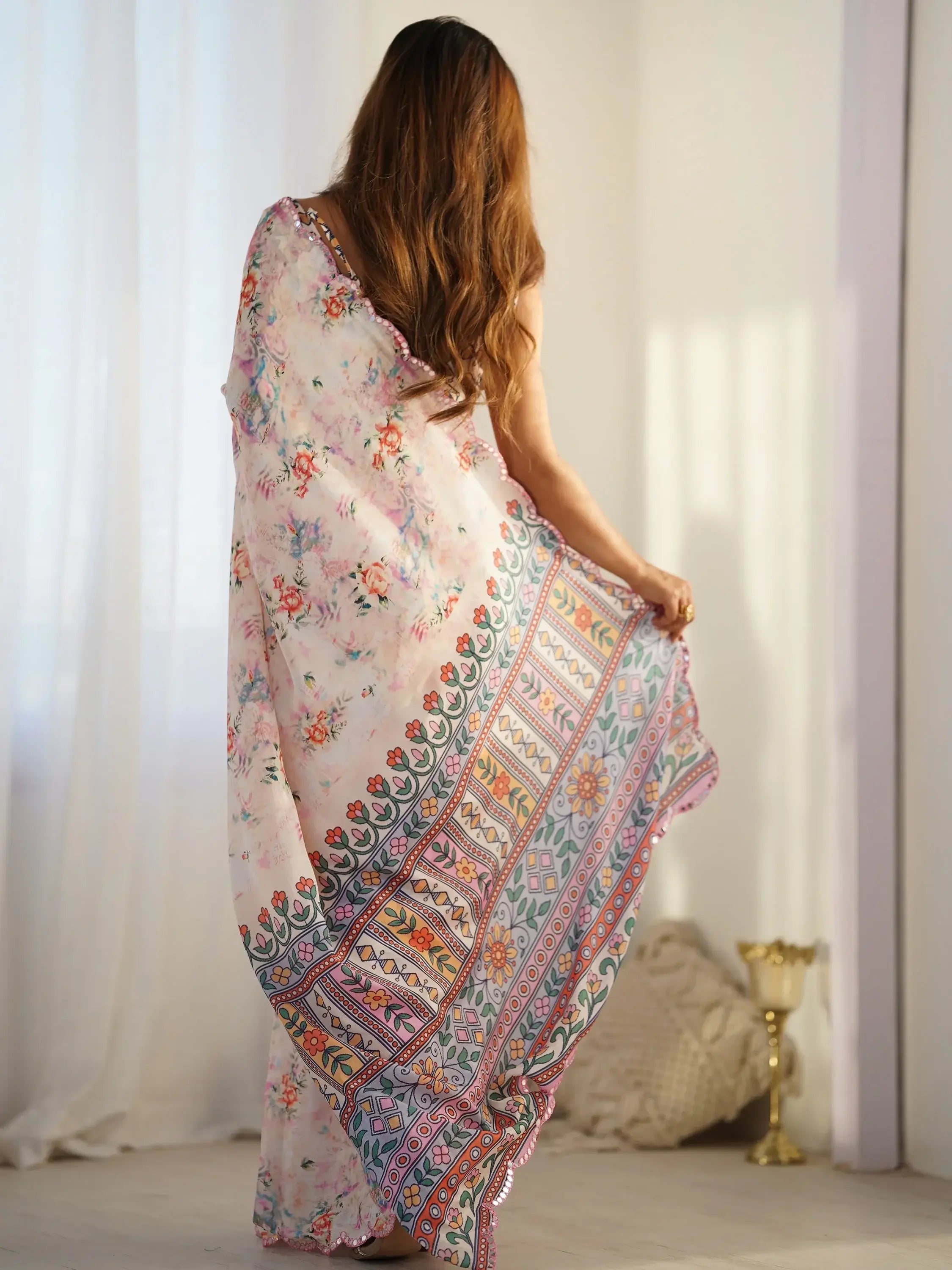 This beautiful cream saree is endless. It is perfect for both casual occasions and festivals, allowing you to stand out and make a statement wherever you go. The off-white chinon blouse with digital print work complements the saree perfectly, creating a cohesive and stylish ensemble.