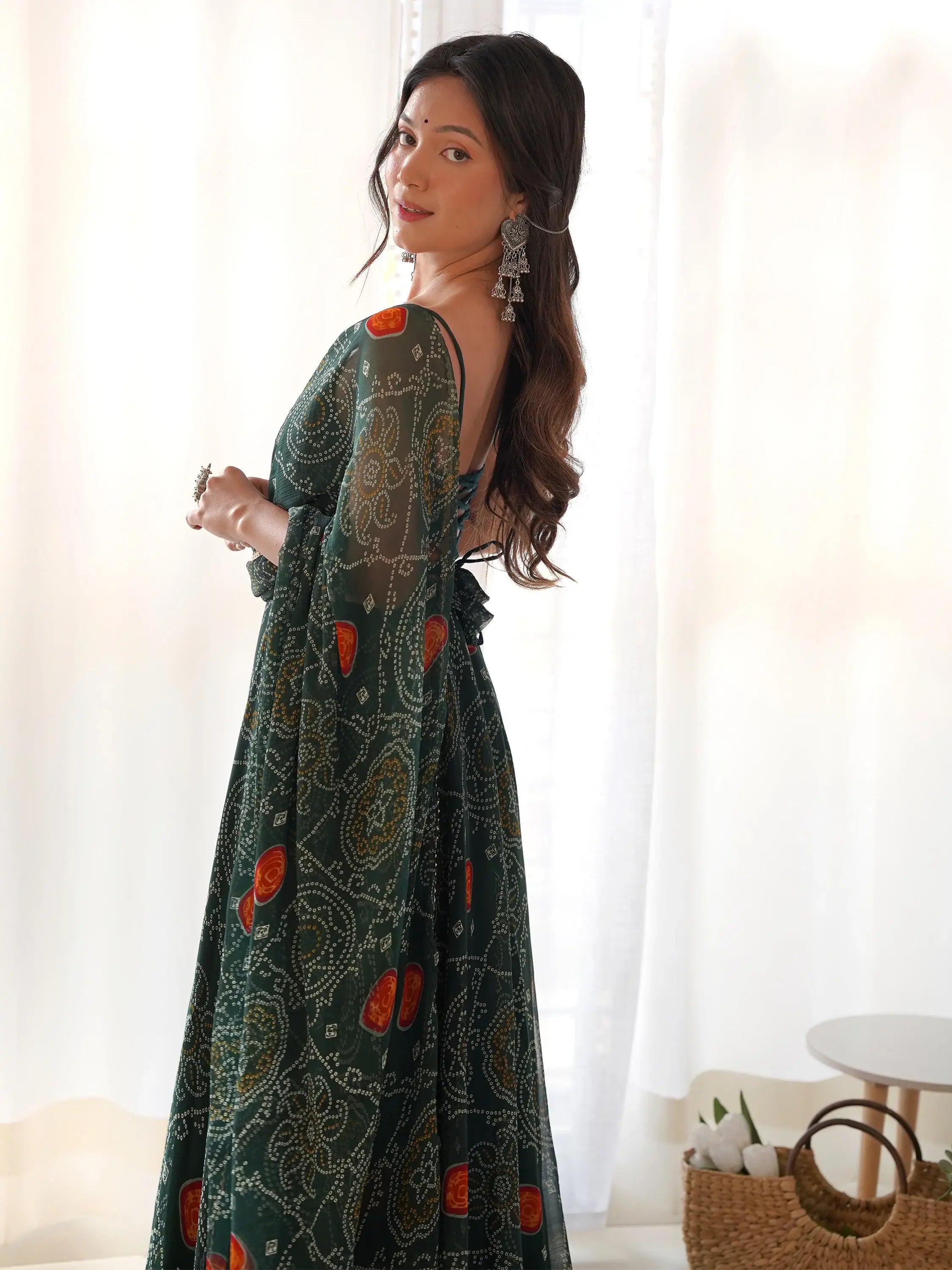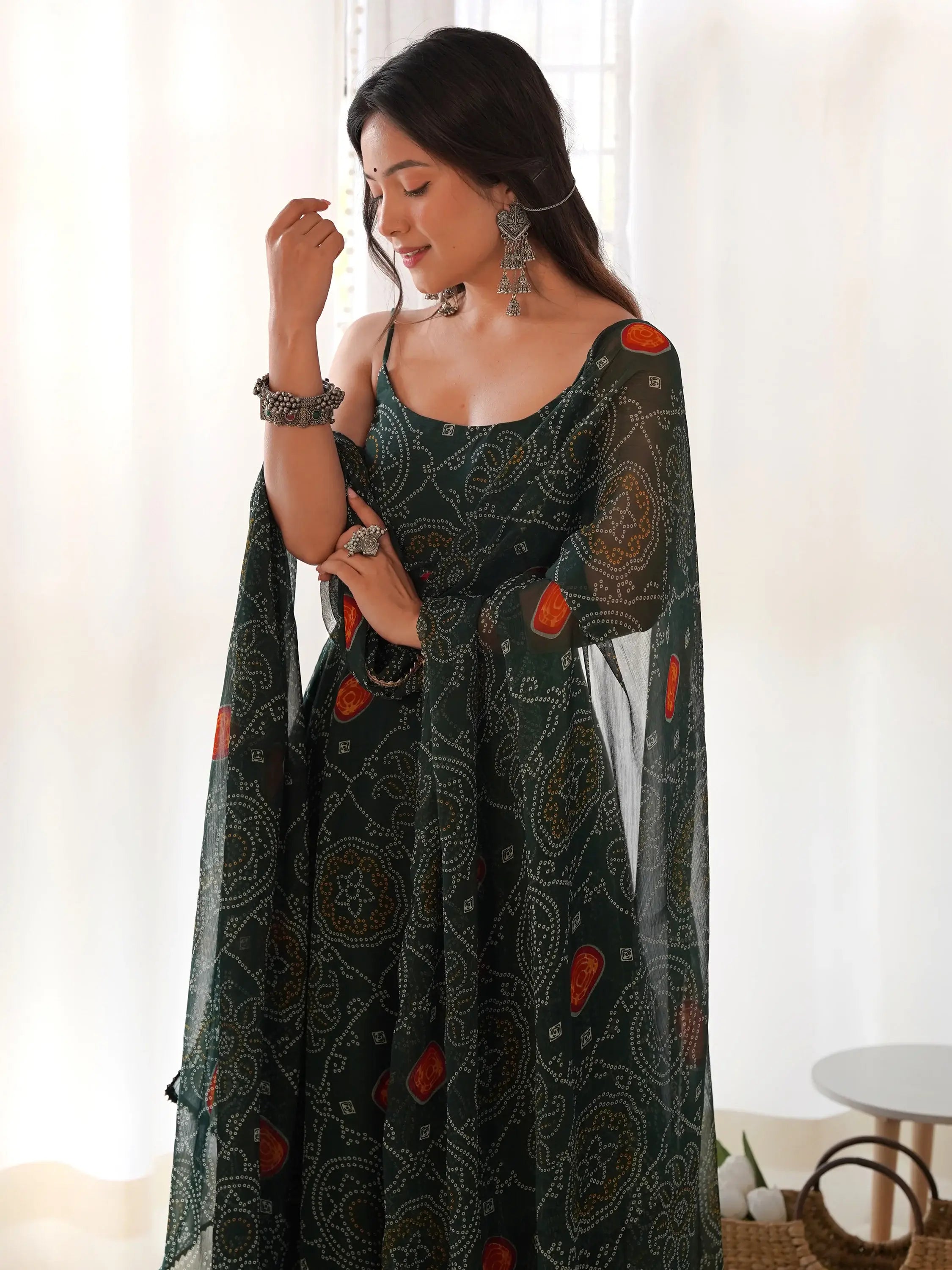 Pair this stunning gown with your favorite accessories to elevate your look and make a style statement wherever you go. Whether you're attending a wedding, a cultural event, or a festive celebration, this green bandhani printed chiffon gown is sure to turn heads and make you the center of attention.