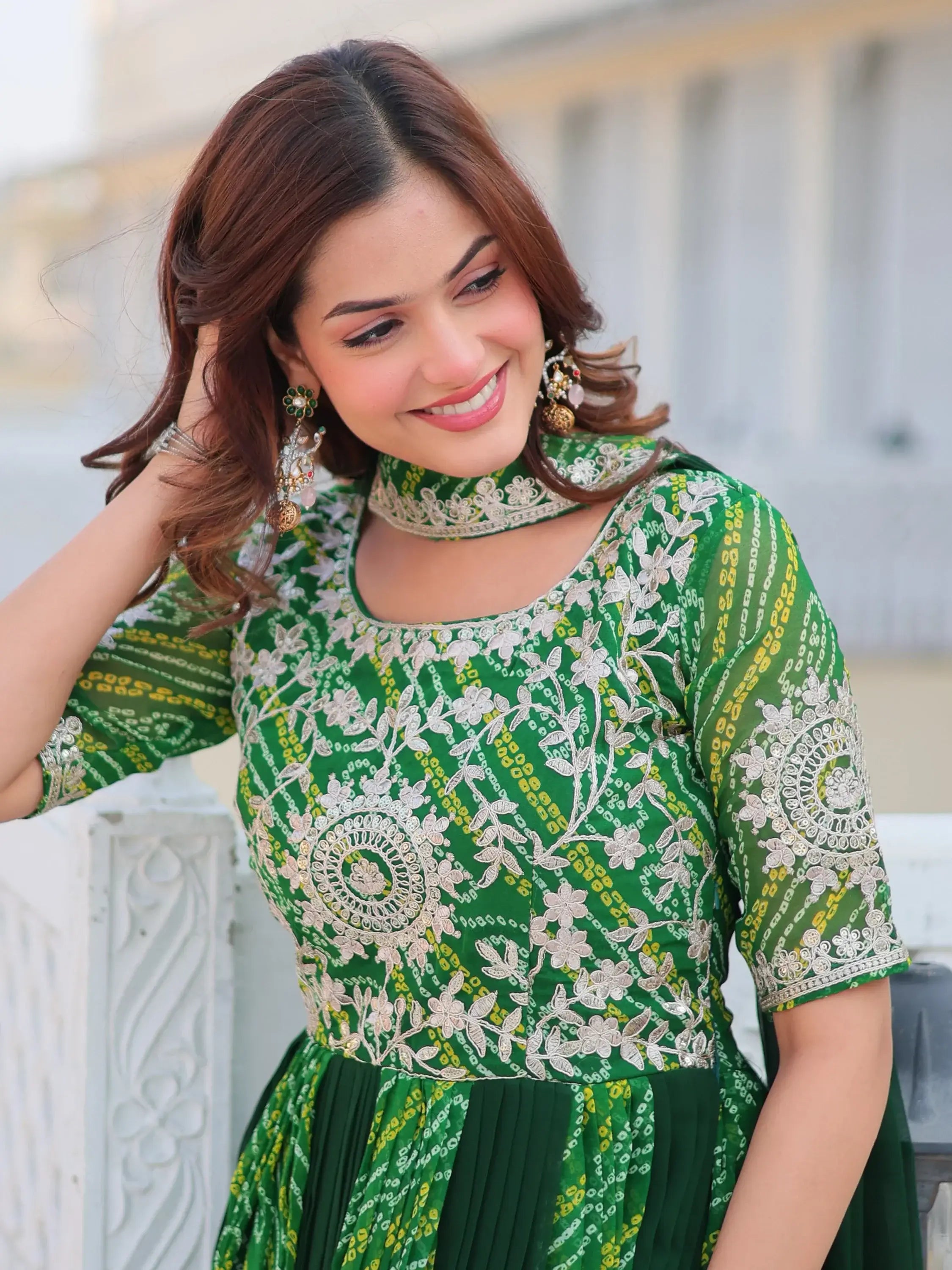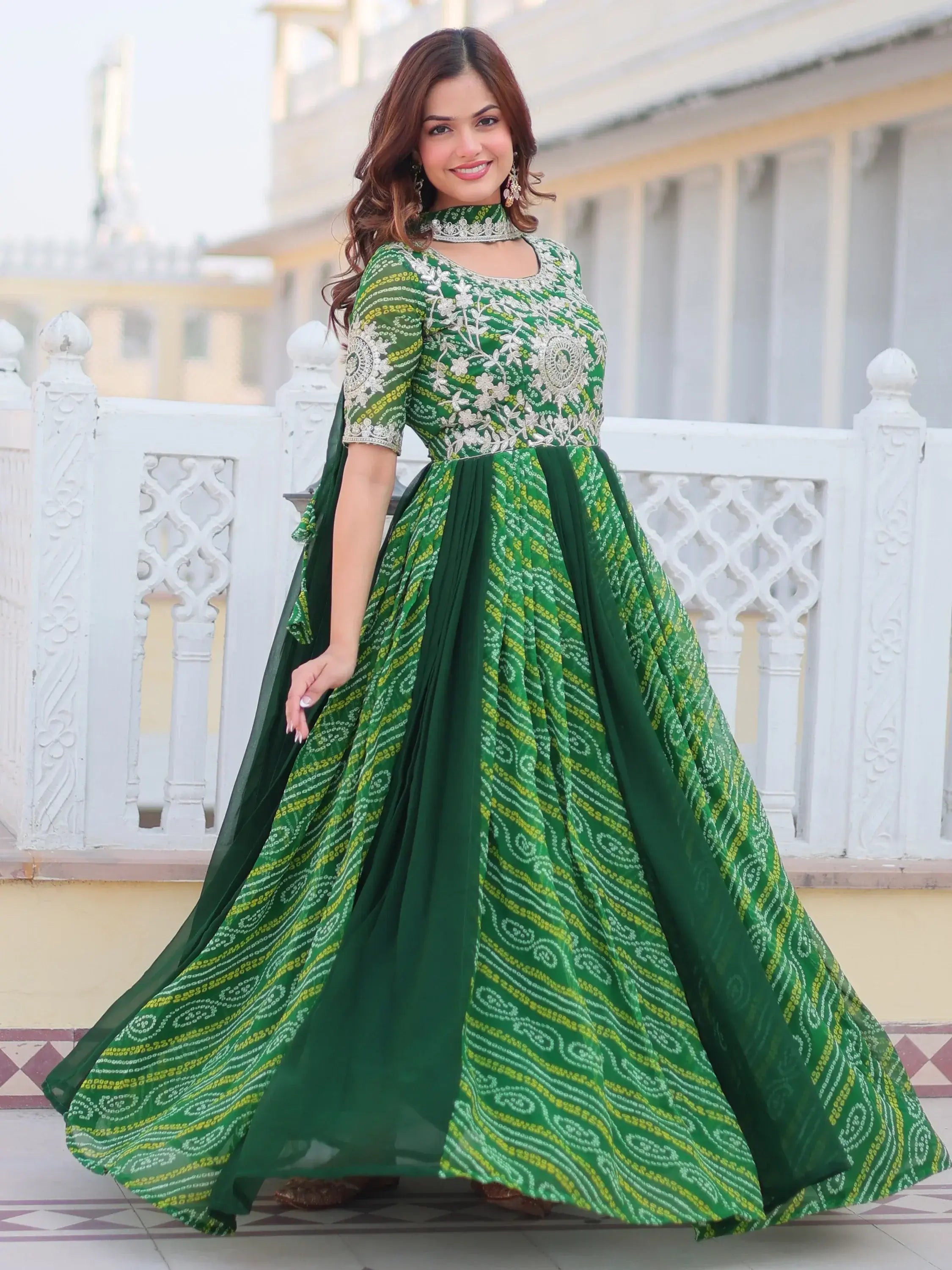 Introducing our stunning green bandhani printed georgette festival wear gown, a must-have addition to your ethnic wear collection. This beautiful gown features intricate thread embroidery, sequin work, and bandhani print detailing, making it a standout piece for any special occasion.