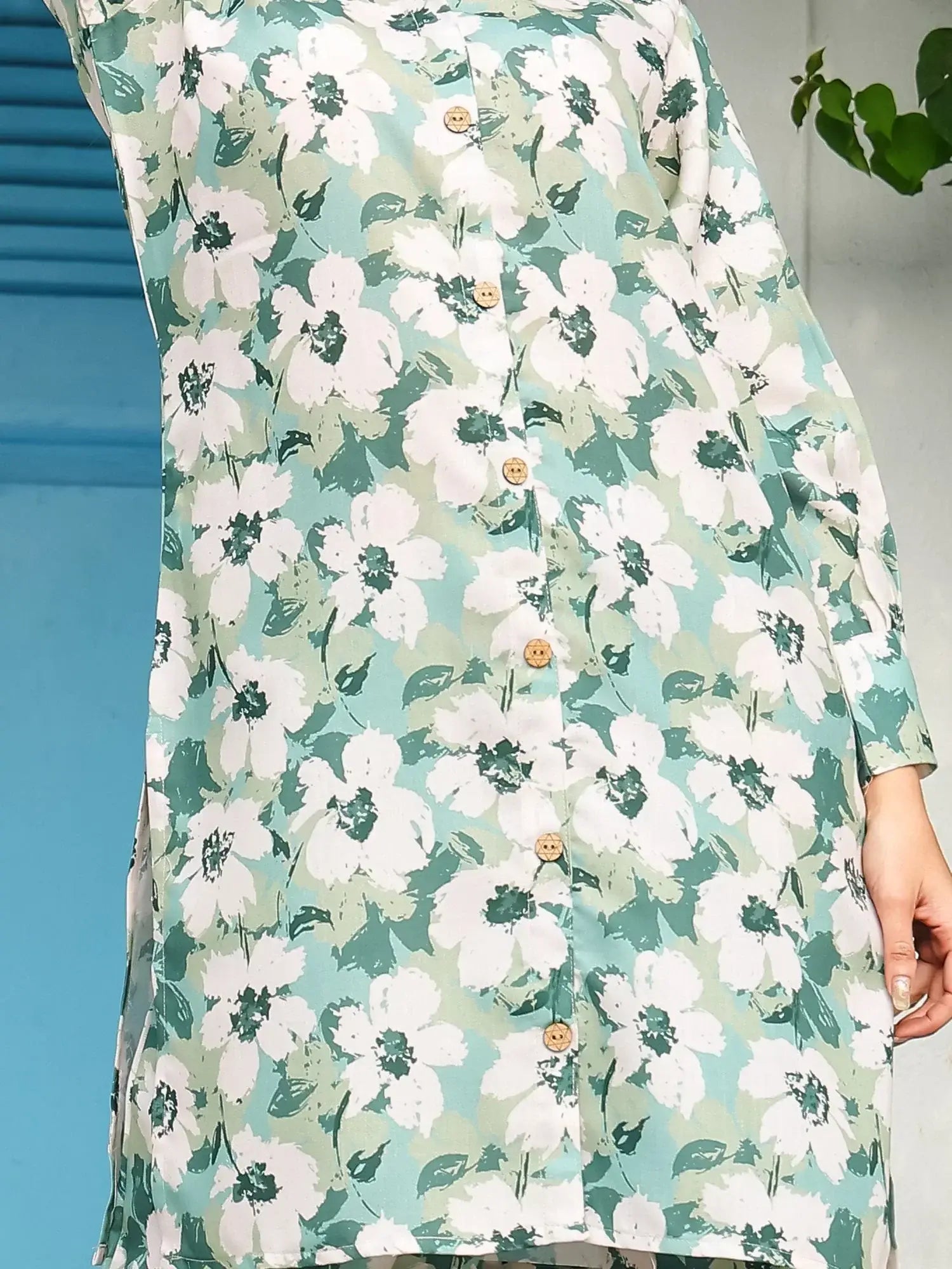 This green floral printed cotton top palazzo co-ord set include the vibrant green color that is sure to make you stand out in a crowd. The floral printed work adds a trendy and fashionable touch, while the palazzo style bottoms offer a flattering and versatile silhouette. Pair this set with your favorite accessories to create a unique and stylish look that is perfect for any outing.