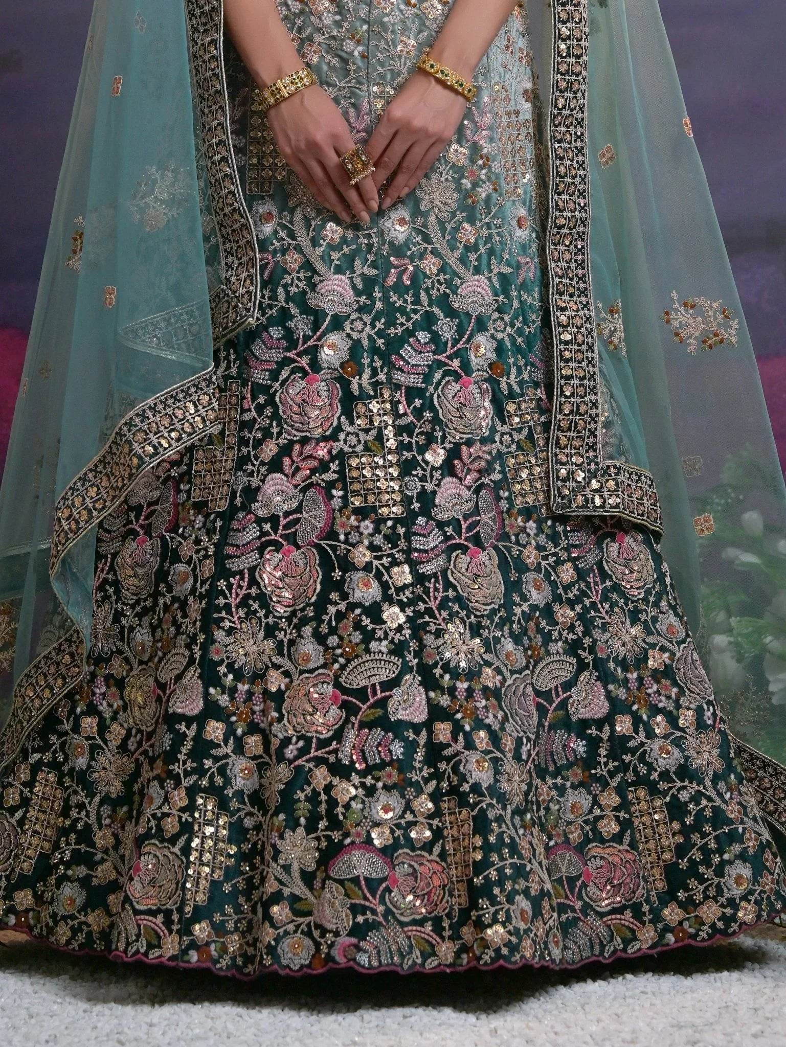 This exquisite ensemble includes a green color lycra lehenga with sequin, diamond, dori, and embroidered work, a similar color lycra choli with matching embellishments, and a green net dupatta with embroidered and sequin lace borderwork.