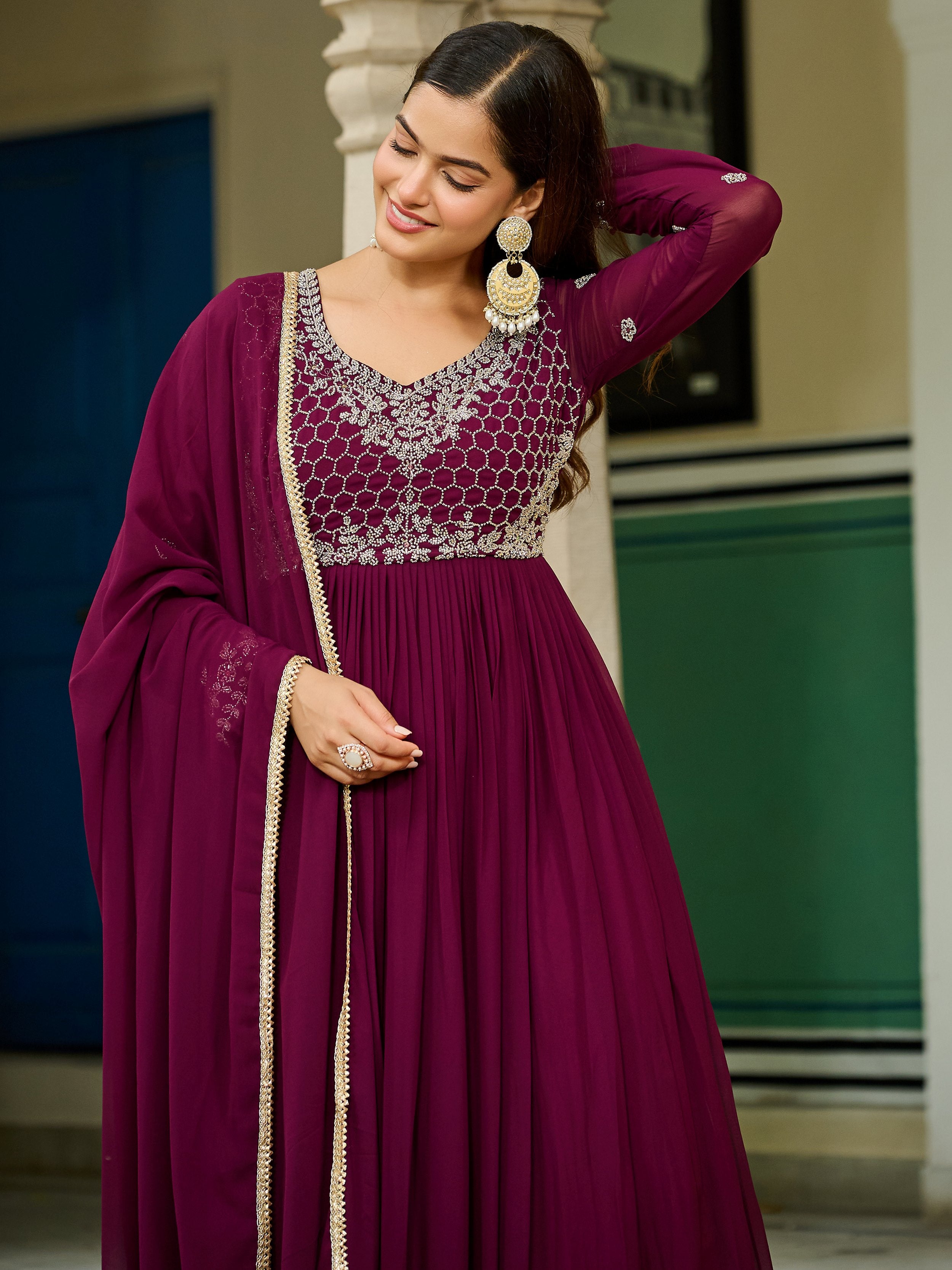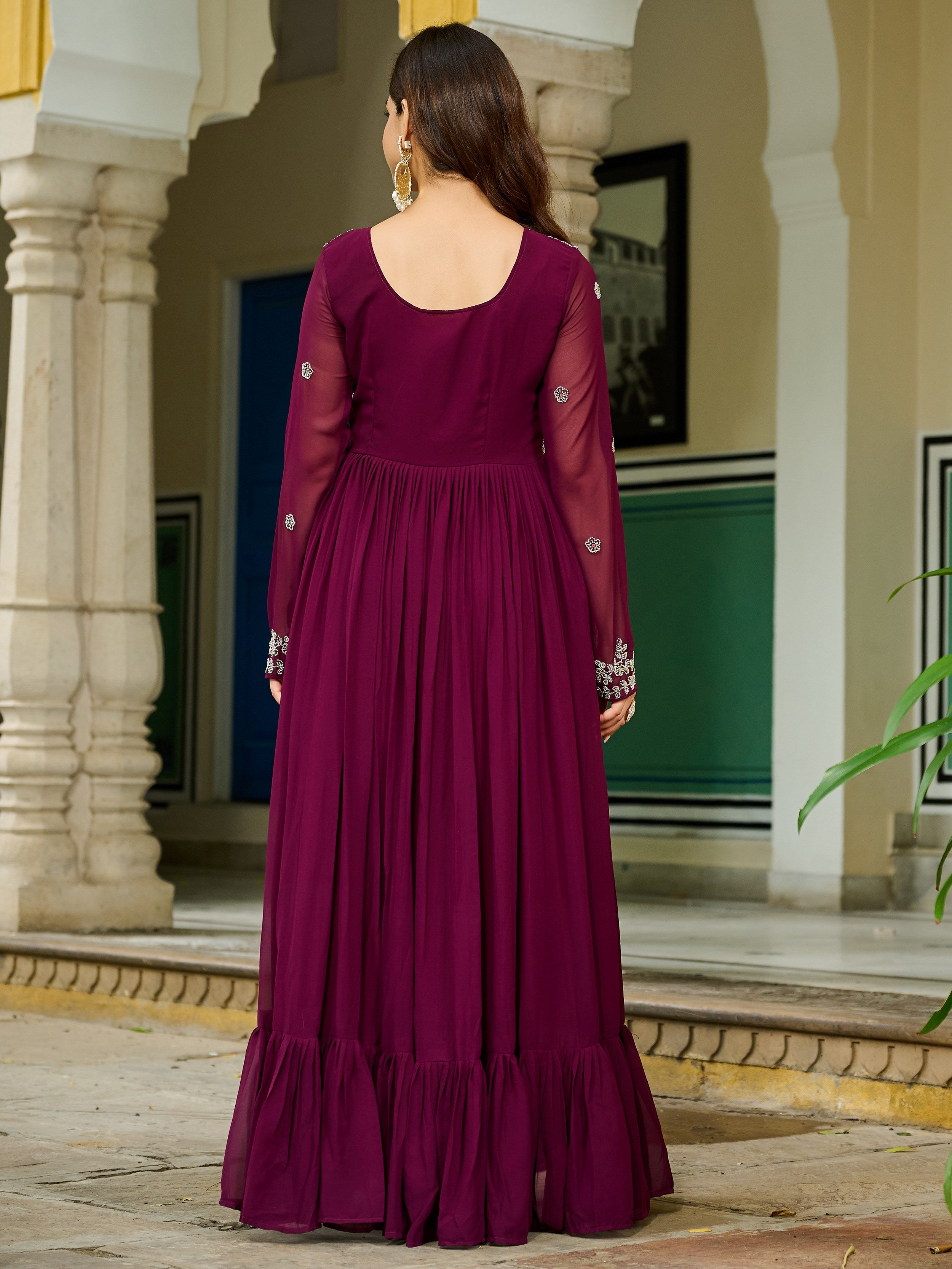 This gorgeous wine-colored gown is crafted from Faux Blooming fabric with stunning beads embroidery, giving a grand and luxurious festive appeal. The elegant Pan V-neck and full sleeves enhance its stylish and graceful look.