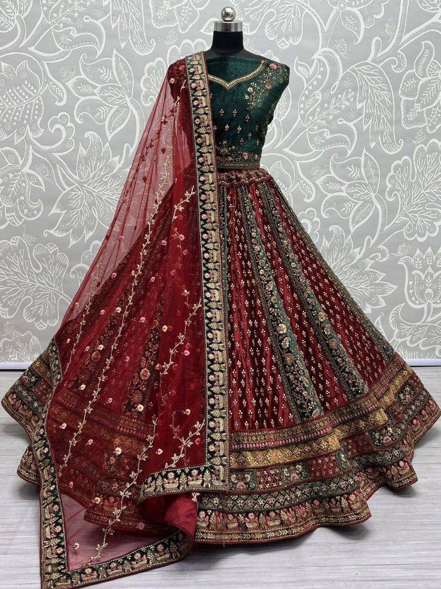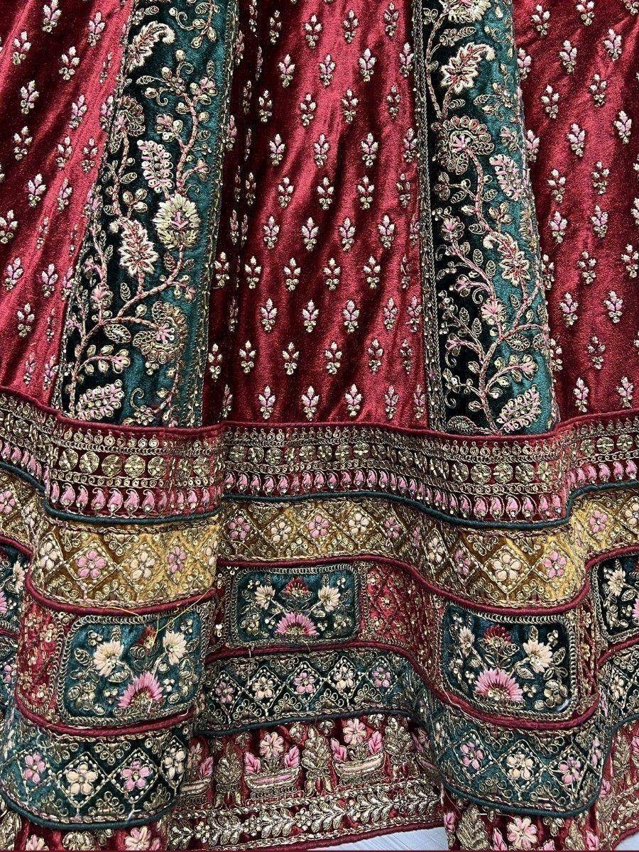 Introducing the stunning maroon embroidered velvet bridal lehenga choli with dupatta from Ethnic Plus! This exquisite bridal lehenga is crafted with maroon color velvet material, featuring intricate fancy dori work, multi-thread work, sequin work, embroidery work, and diamond work.