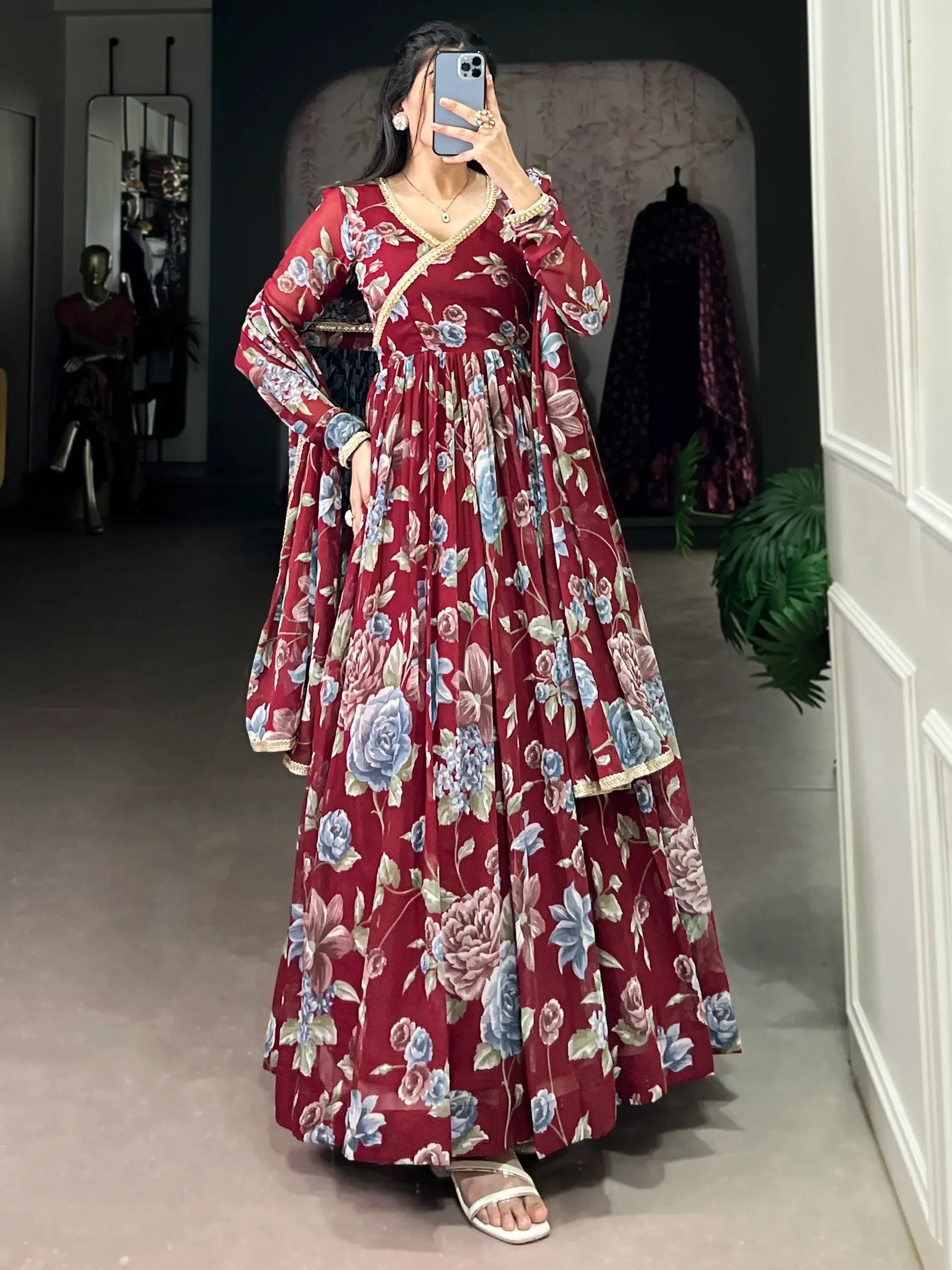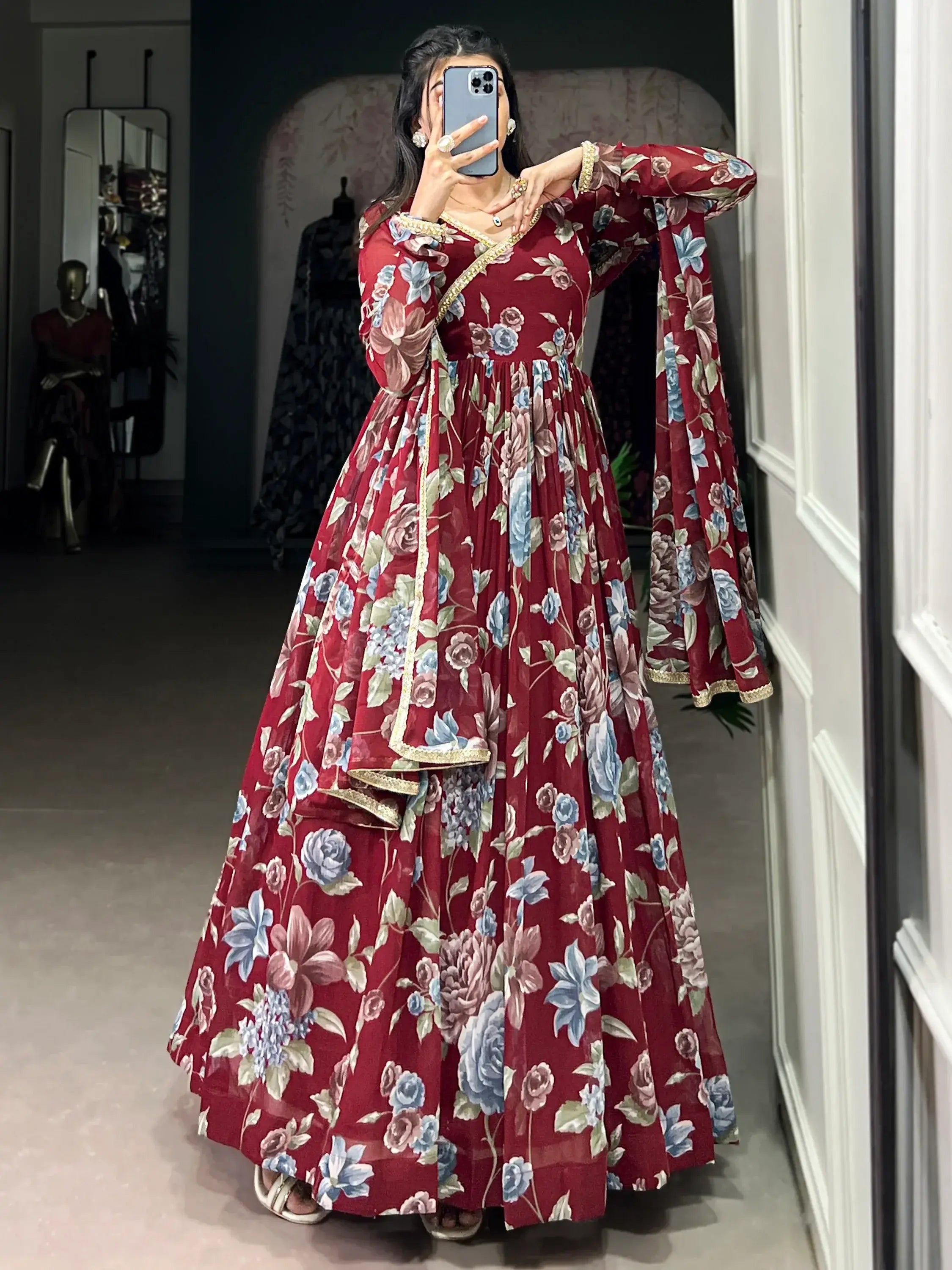 This gown include its high-quality georgette fabric, which is lightweight and drapes beautifully on the body. The floral print work adds a touch of femininity, while the lace detailing lends a touch of sophistication. Whether you're attending a festive event or a special evening occasion, this gown is sure to make you look and feel your best.